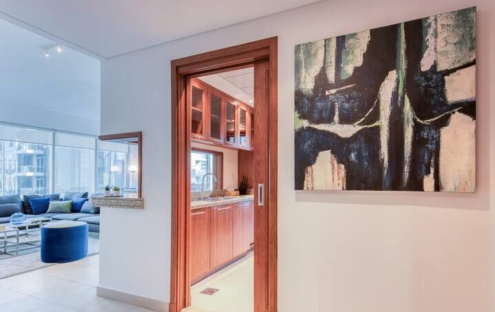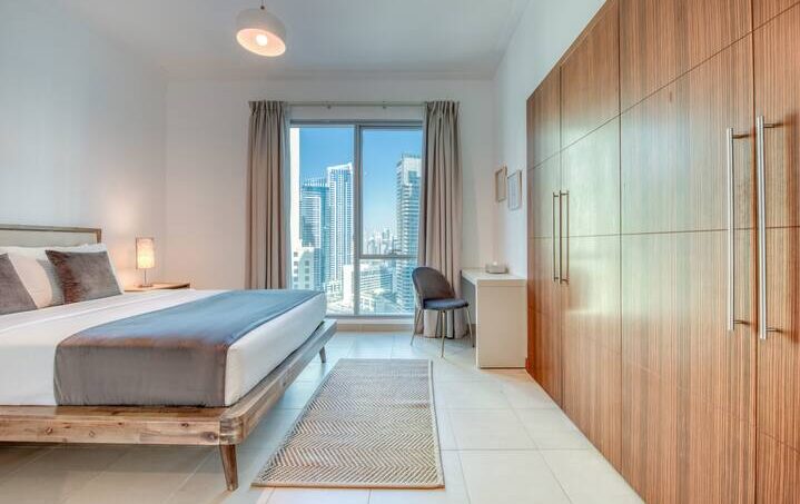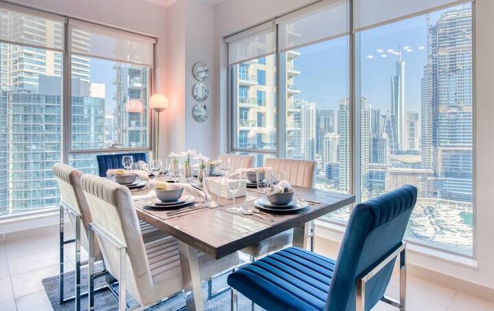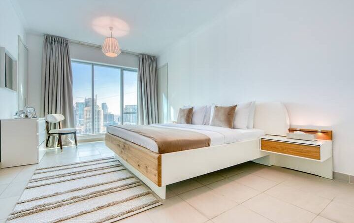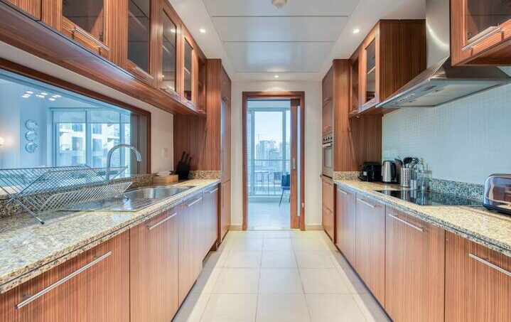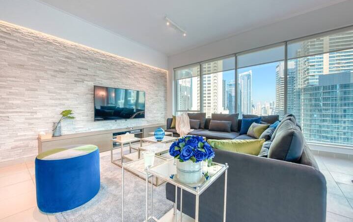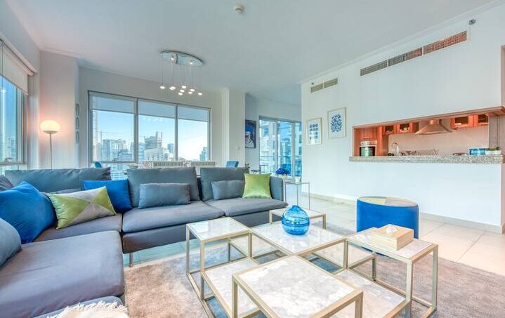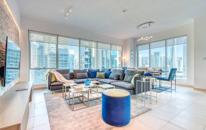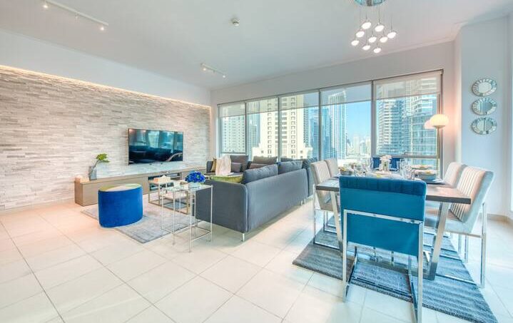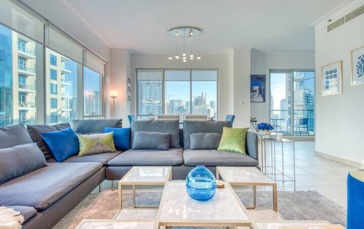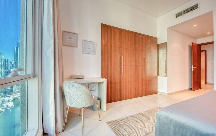 Offering all the perks in waterfront living, this luxury apartment is nestled between the palm-lined Dubai Marina waterway and the JBR Beach. Feel the sand in your toes or hop on a waterbus to the mall in less than 5 mins. Delight in any of the hundreds of eateries with international cuisine that the neighborhood has to offer, then ride the tram to the Dubai Mall, the Burj Khalifa and beyond. It’s all possible when you stay here.