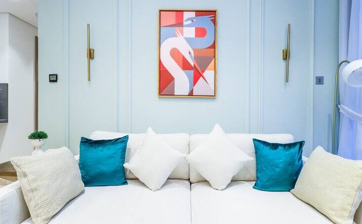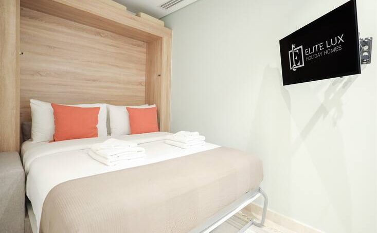 As you step into the apartment, you’re greeted by a spacious and elegantly furnished living room. It features a plush large sofa, a sleek coffee table, and a large smart TV, creating the perfect ambiance for relaxation and entertainment. The living area seamlessly flows into a fully equipped kitchen, complete with modern appliances and cookware, ready for you to whip up your favorite dishes.