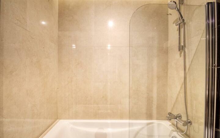 – Bathroom with bath, clean towels and hygiene products