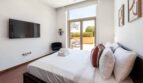 A sanctuary of luxury, the master suite boasts a king-size bed adorned with bedside tables and a chest of drawers. Soft lamp lighting provides an inviting ambiance, while the fully dressed floor-to-ceiling terrace doors grant access to a private viewing deck. Fitted wardrobes accompany the room, accommodating all your holiday essentials. Additionally, an en suite bathroom awaits, complete with a fitted tub and shower facilities.