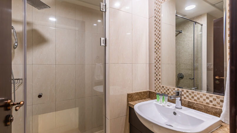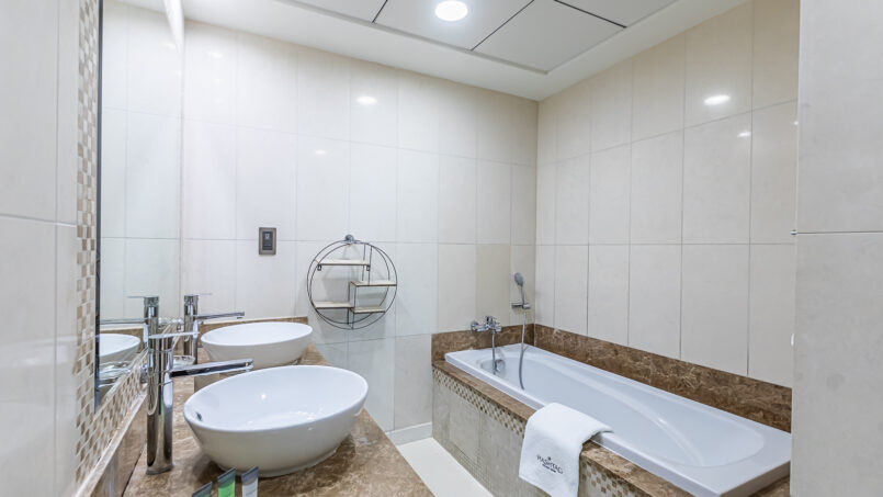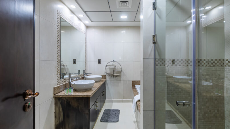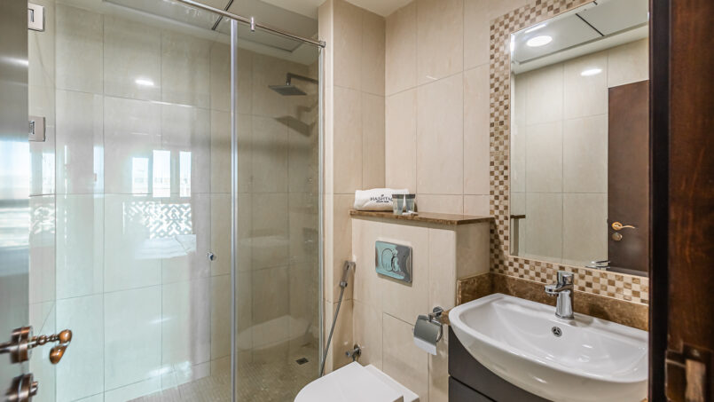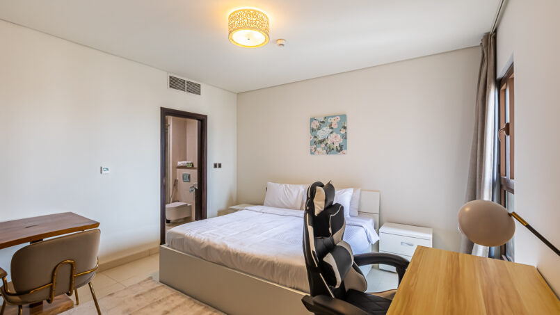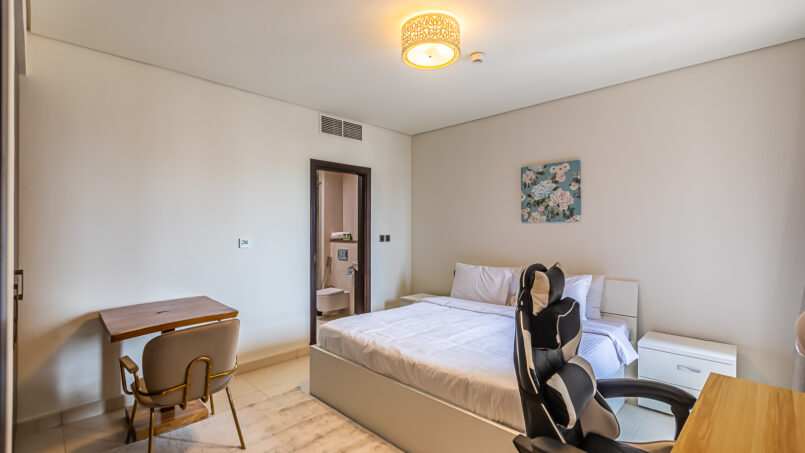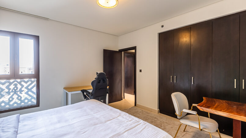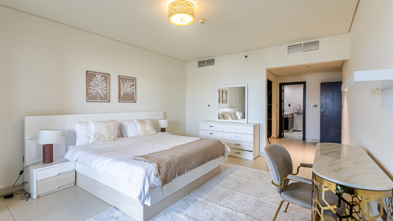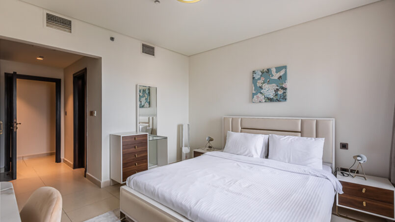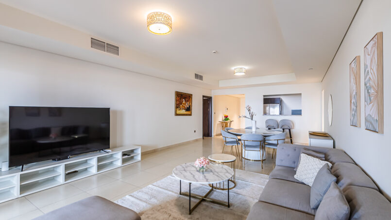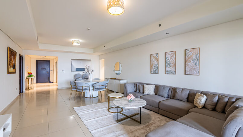 The bedroom is thoughtfully designed with high quality furniture and bed settings also full private bathroom in each bedroom and in maid’s room, + 1 guest bathroom. The property features a fully equipped kitchen with all appliances ,modern bathrooms filled with toiletries and storage facilities. The living room is well put together with a modern twist and a classic look, with a large sofa, smart TV and dining area overseeing beautiful views of the city and sea view. You will discover an apartment with high-end luxury furniture and a contemporary design that creates an inviting atmosphere.