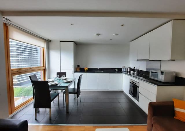 A superb 15th floor apartment set within a modern, secure residential building in the heart of Canary Wharf. The apartment has wonderful natural light and spectacular views. Large bedroom with King-sized bed. The reception room and kitchen provide open plan living and the views across London from here are fantastic. The kitchen is spacious, has granite worktops, dishwasher, washer dryer, fridge / freezer and an electric oven and hob, plus microwave, kettle and toaster.