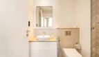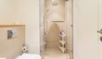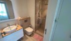 Bathroom is accessible from the bedroom and has a toilet, sink, and shower with shampoo and body gel.