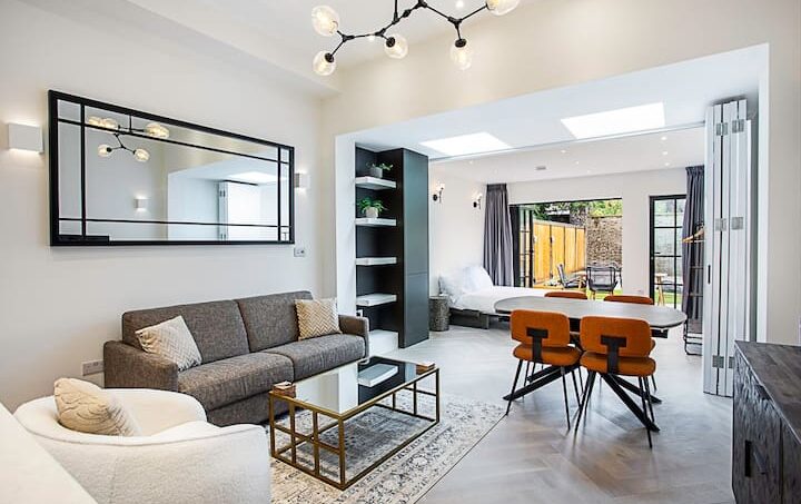 This two-bedroom apartment is situated in the idyllic area of Acton. Located on the ground floor, this beautiful Central London flat can comfortably accommodate up to four people. The smoke-free property features a living room, two bedrooms, two bathrooms, a kitchen, and a terrace.