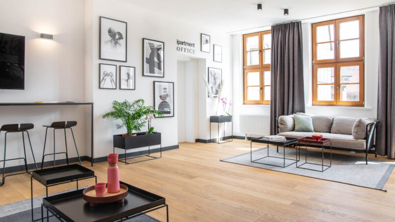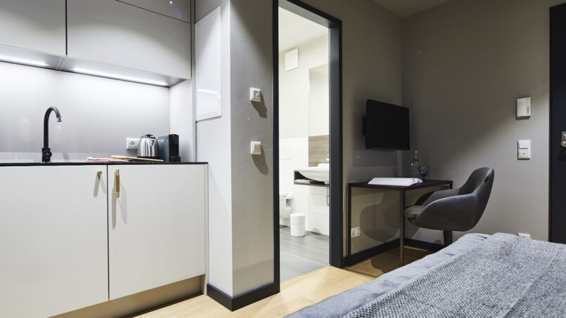 More space, even for two: the Smart ipartment has everything you need for a longer and more comfortable stay. It is fully equipped and cleverly divided. Designer kitchen, boxspring bed, living area and work space included.