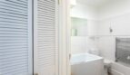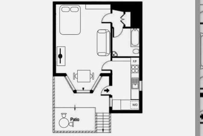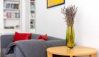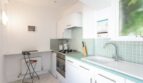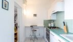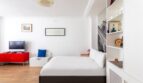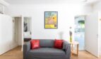The living room is equipped with a sofa and a dining table that can seat two people. The kitchen is fully fitted with modern appliances. The master bedroom comes complete with a queen-size bed. The apartment also features a bathroom, respectively equipped with a bathtub with an overhead shower.