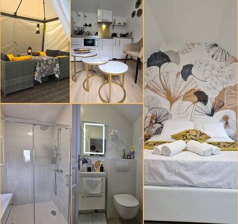 Ce petit bijou totalement rénové et décoré avec goût dans les teintes doré et vert. Cet appartement se trouve dans une maison qui a été divisée en 2 pour créer 2 appartements indépendants mais partageant un palier. Il est composé d’un salon/cuisine, d’une salle d’eau et d’une chambre.