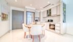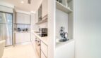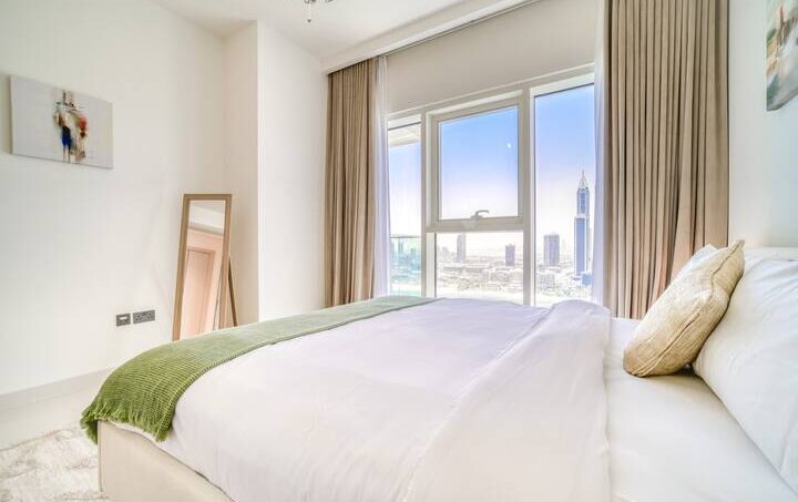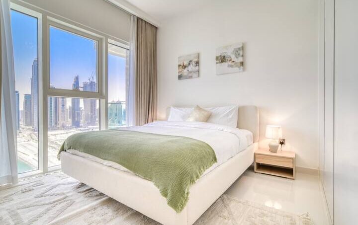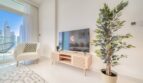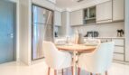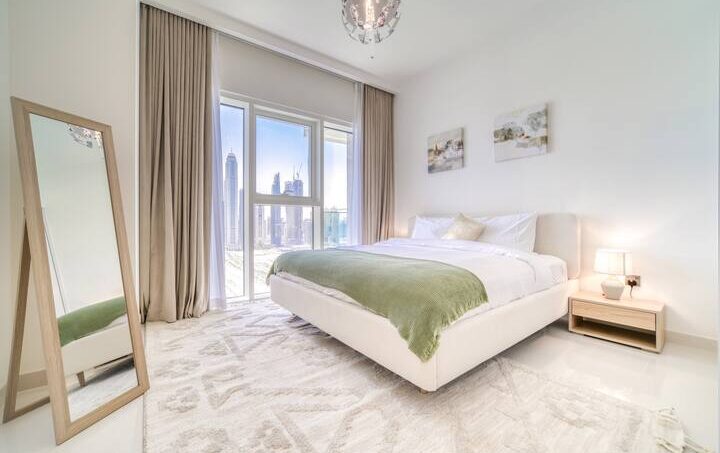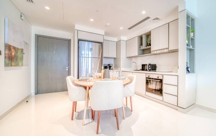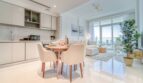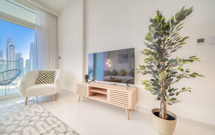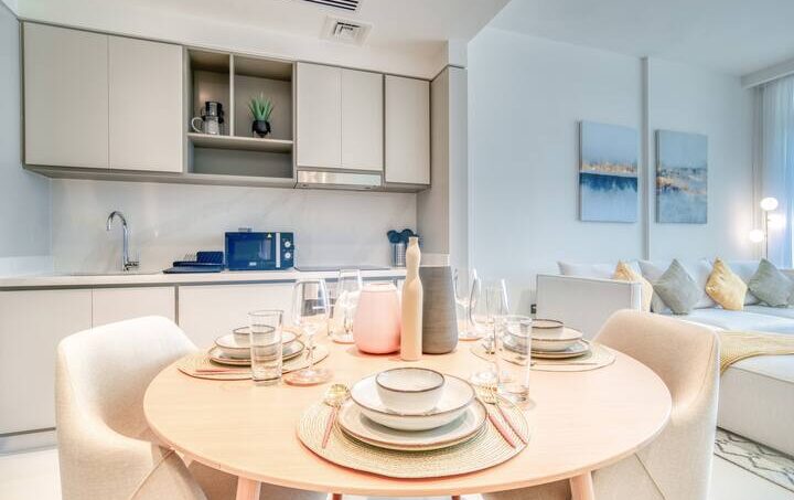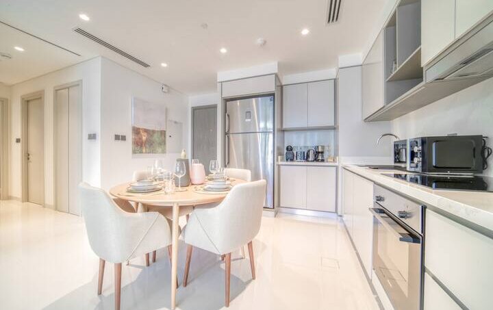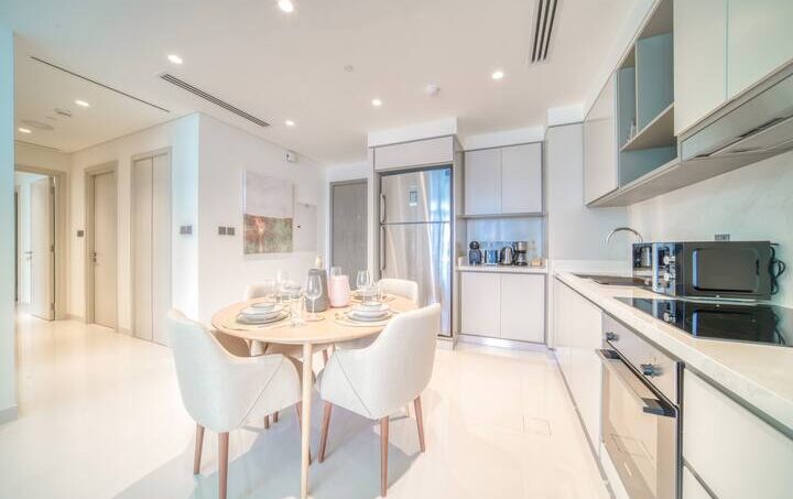 The living space of this two-bedroom apartment has fabulous furnishings and fittings to include a large L-shaped sofa, a coffee table, modern art, a TV and access to the balcony. There is a stunning dining table with comfortable seating to accommodate up to four guests with large windows allowing for amazing views while enjoying meals. The fully fitted kitchen comes complete with all the necessary appliances for a seamless stay and those special extras of high-quality cabinetry that adds to it’s established air of elegance.