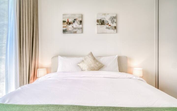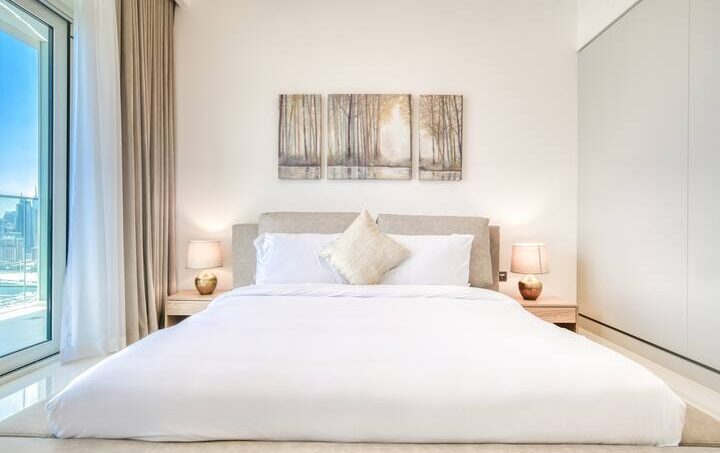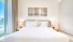The second bedroom is also furnished to an exceptionally high standard featuring modern art, a double bed, premium bedding, side-tables, and fitted wardrobes.