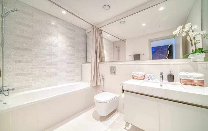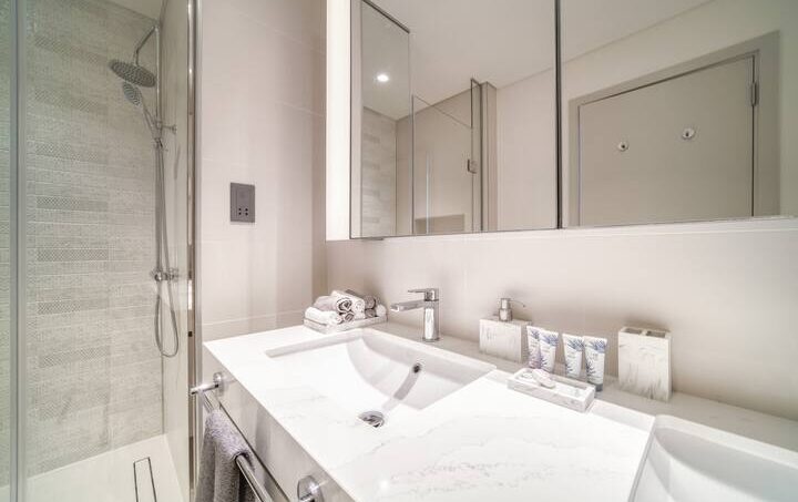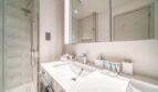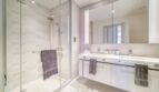 The master bedroom features a queen sized bed with premium bedding, side-tables, and lamp lighting with fitted wardrobes for your convenience. The en suite bathroom contains a large walk-in shower alongside his and her sinks.