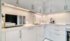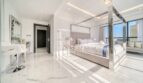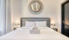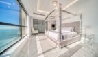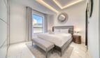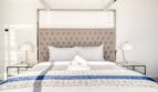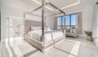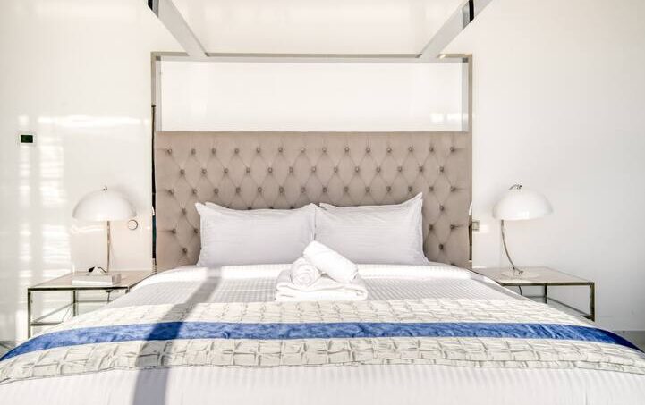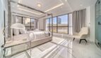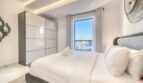The bedroom is flooded with sunlight as it streams through the large windows that overlook Bluewaters Island. The bed is a luxurious king-size mattress, dressed in crisp white linens and a plush quilted headboard. Sipping a morning cup of coffee while gazing out the window is ideal from the comfy chair beside the window. In addition to a large wardrobe, this room is furnished with a comfortable three-seater sofa that invites one to relax.