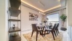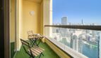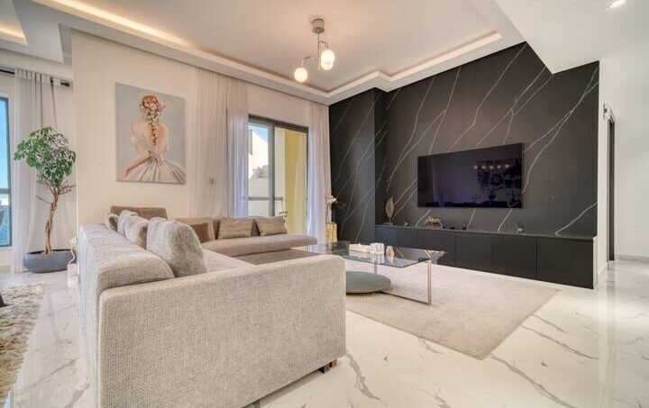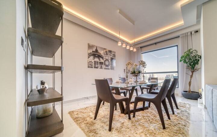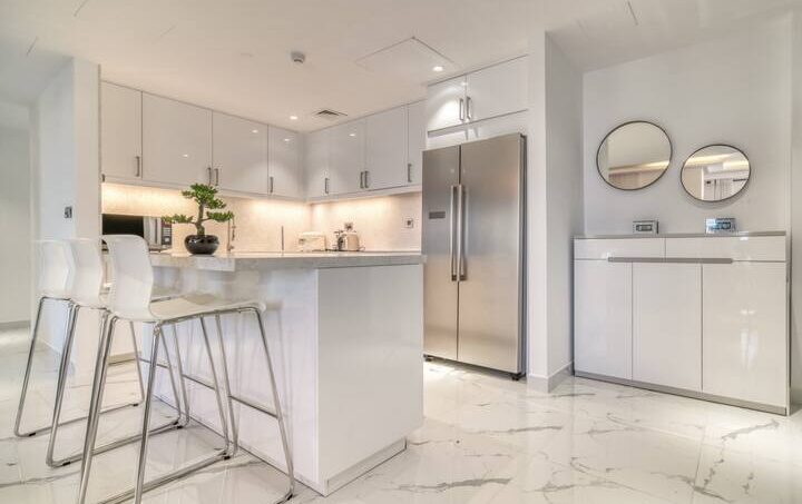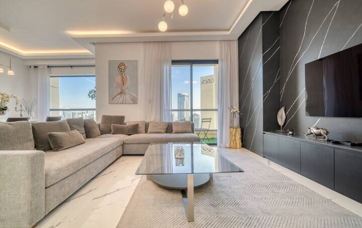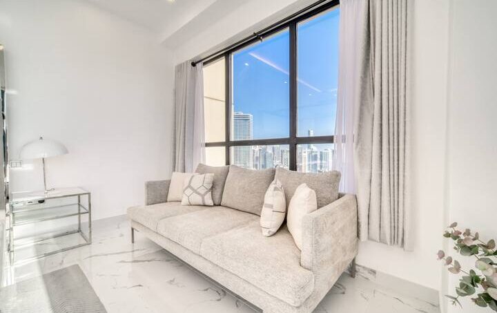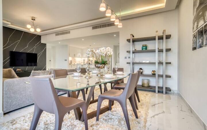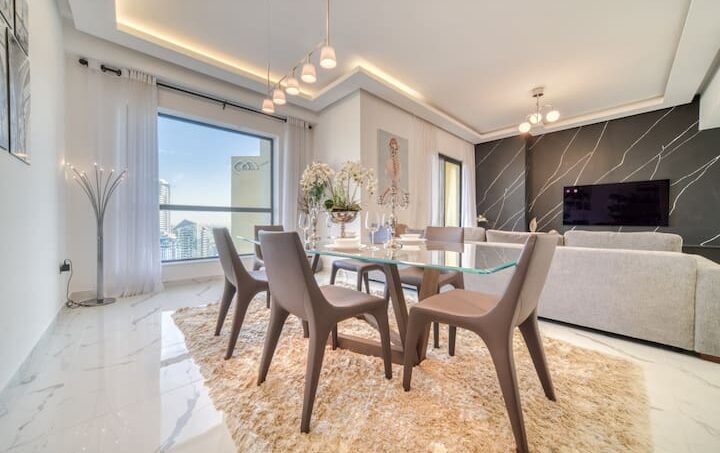“Oh wow”, is how you may react when you enter this lovely two-bedroom apartment located within Dubai’s vibrant Jumeirah Beach Residence. This stunning place offers a wealth of amenities and unparalleled city and water views from the balcony. The spacious and modern apartment is designed to maximize comfort and convenience, with two generously sized bedrooms, two bathrooms, and a large living area. This living room is an inviting space for entertaining, with plenty of space for guests and cozy seating, thanks to its pastel gray sectional sofa that perfectly complements the glass coffee table and well-chosen artwork. Getting ready for meals will be a breeze in the kitchen, which has plenty of counter space and high-end appliances. Gather around the dining table with six seats while the meal is being prepared and share your unforgettable Dubai experience.
