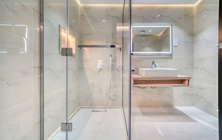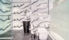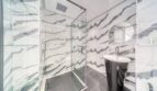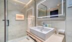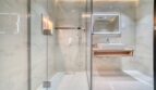 This luxury master bedroom comes with an en suite bathroom that is the perfect finishing touch. Panda white tiles cover the walls of the bathroom, and a gray tile floor adds a touch of elegance. A glass doored shower adds a contemporary touch to the bathroom, and a freestanding washbasin cabinet with a mirror complements the design. It is indeed a perfect place for relaxation and rejuvenation.