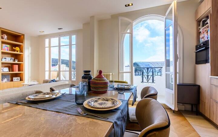 Les fenêtres généreuses offrent des vues panoramiques sur Le Parc Des Princes et le Stade Jean Bouin, créant une atmosphère lumineuse et aérée à l’intérieur.