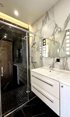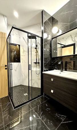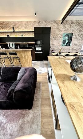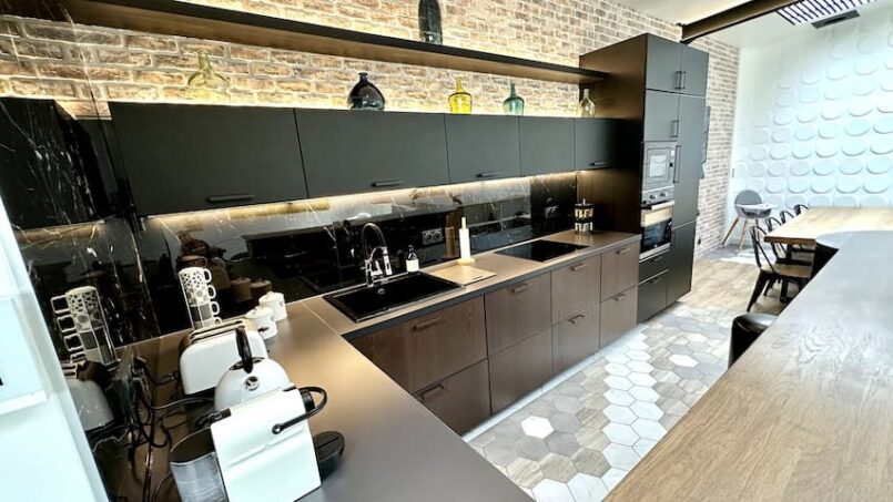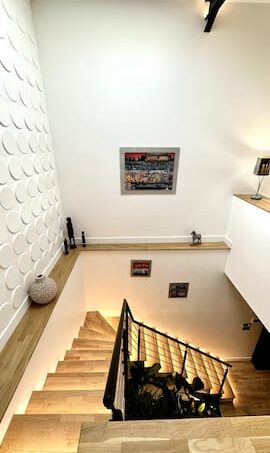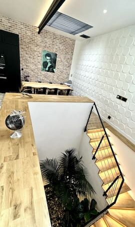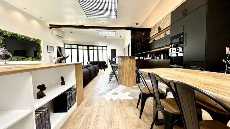 un loft de standing en souplex de 130 m2 au calme et très lumineux, au rdc, un grand espace commun, un WC, une salle d’eau, une cuisine aménagée et équipée. Une partie en sous-sol : 3 grandes pièces avec des rangements + une salle d’eau avec WC.