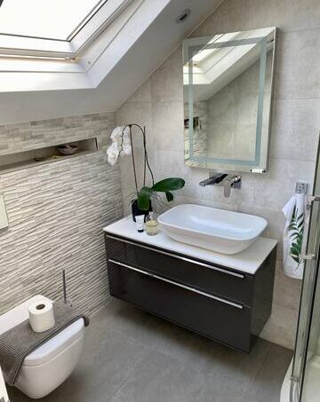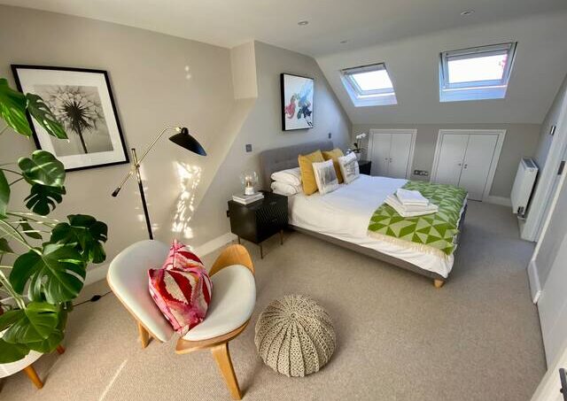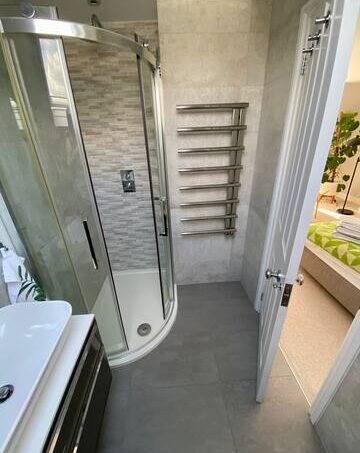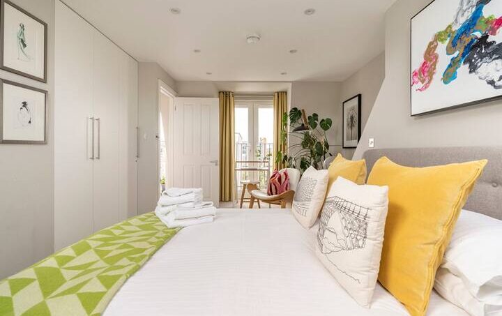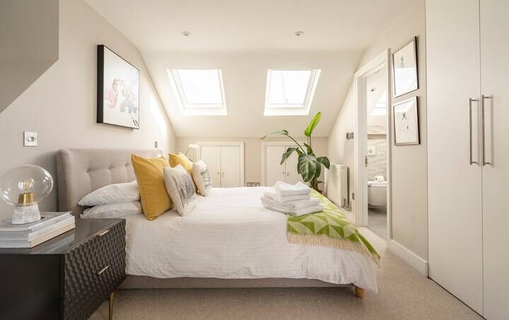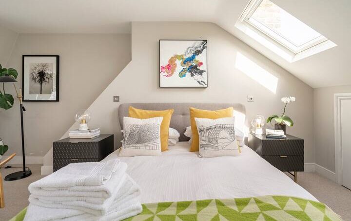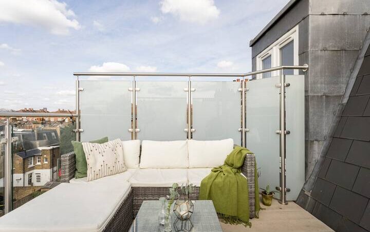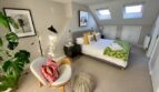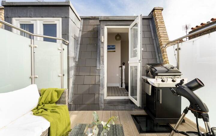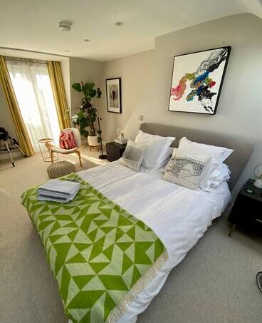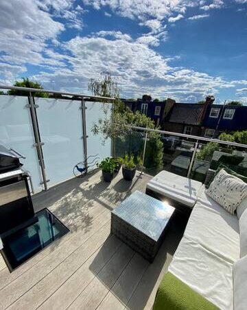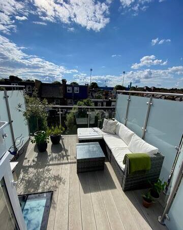 Penthouse bedroom with private bathroom and roof terrace. Extremely spacious with modern decor, comfy king size bed, large wardrobe, 2 bedside tables, high-speed Wi-Fi. Full kitchen access (fridge freezer, oven, hob, toaster, kettle, microwave) & living room with smart TV & dining area. Private roof terrace with panoramic views across West London roof tops. Towels, hair dryer, shampoo, body wash are provided. Ayurvedic Body Treatments available on request. Full treatment list in house rules.