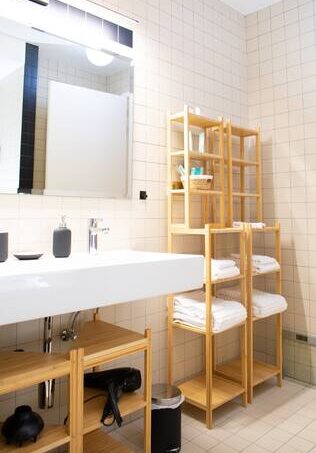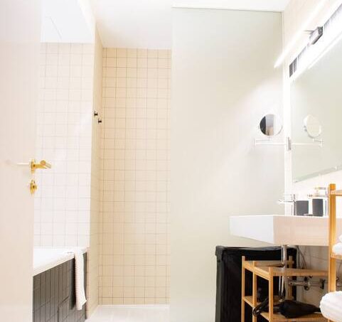 Set in a vintage loft style environment, enjoy a large seating area with a 55 ” Smart-TV a fully equipped counter-kitchen, a practical desk, and a chic dining table. Towards the rear of the apartments you’ll find the 2 bedrooms, each with a king-size bed, with one of the bedrooms leading to a balcony. The three bathrooms facilities are the main bathroom with double vanity, walk-in shower § bathtub/shower, the smaller one with shower cabin and toilet and finally a separate guest toilet.