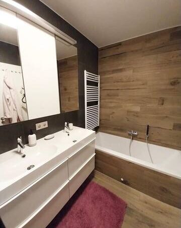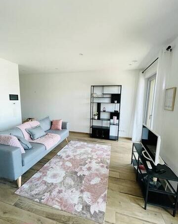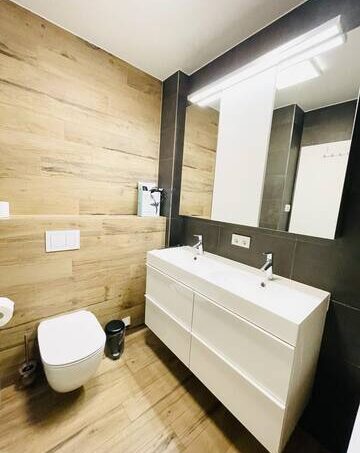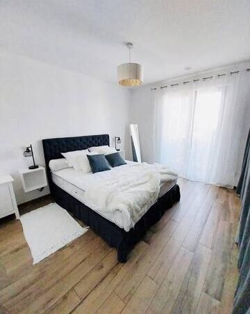 The apartment includes 2 big bedrooms, 2 bathrooms, a fully new equipped kitchen, a dining part, a working area, a large living room, and a nice view with terrace. There is a private parking , washing and drying machine.