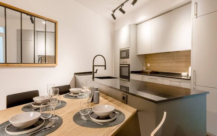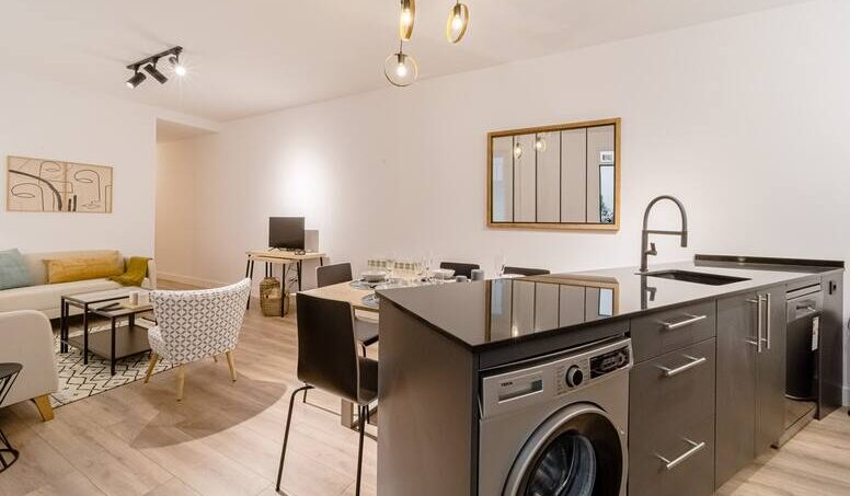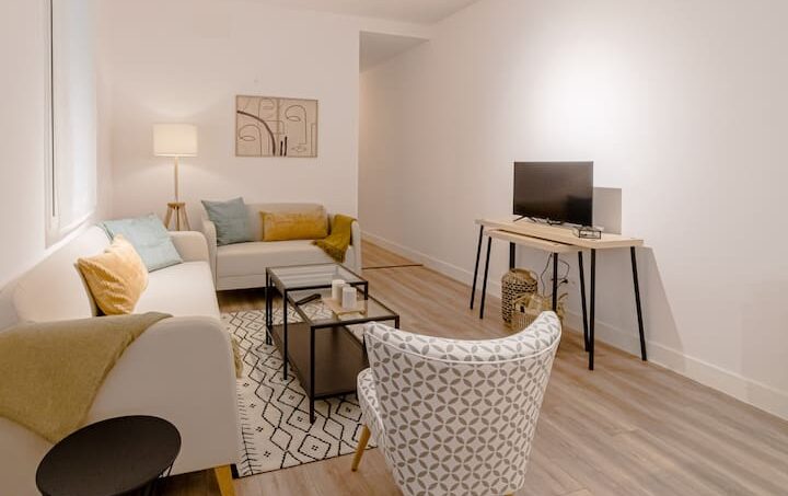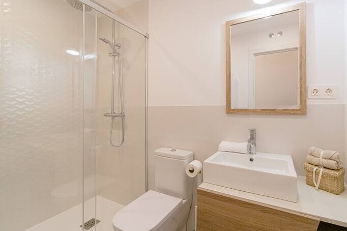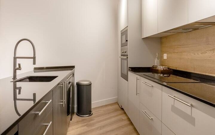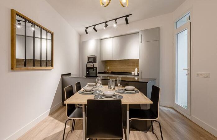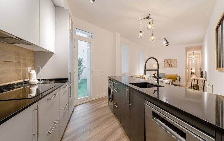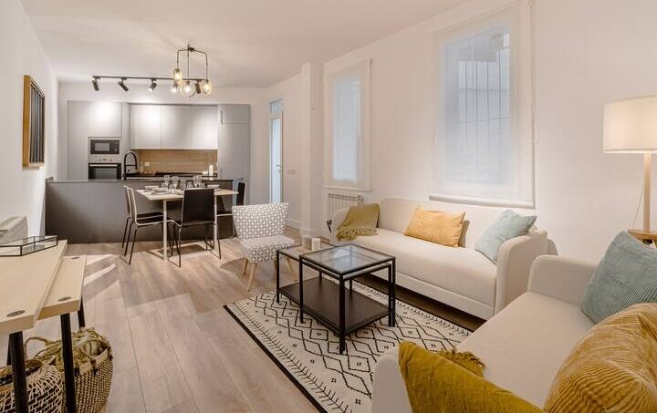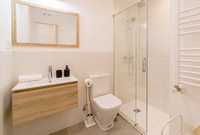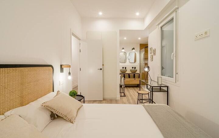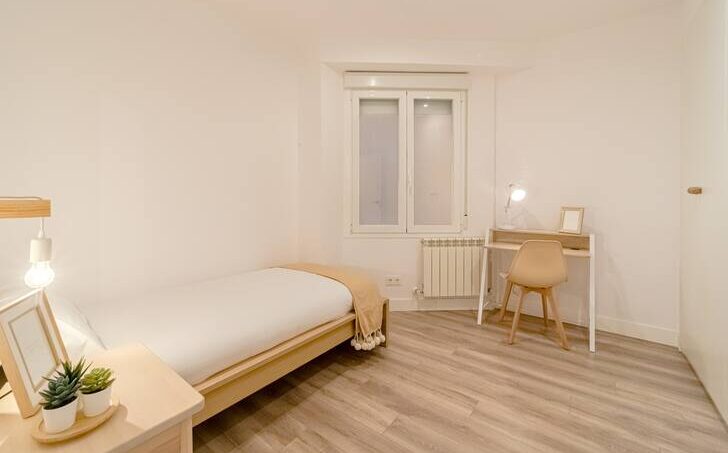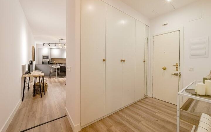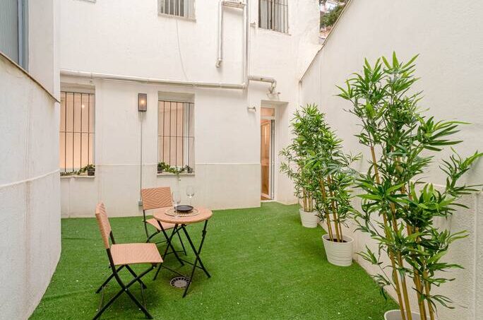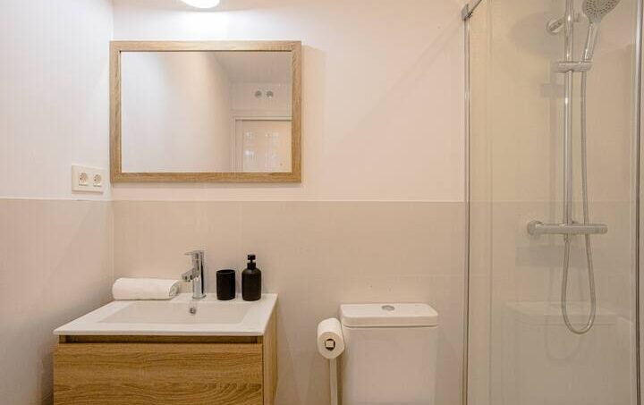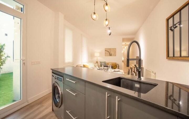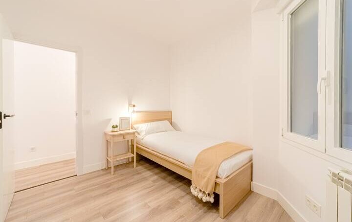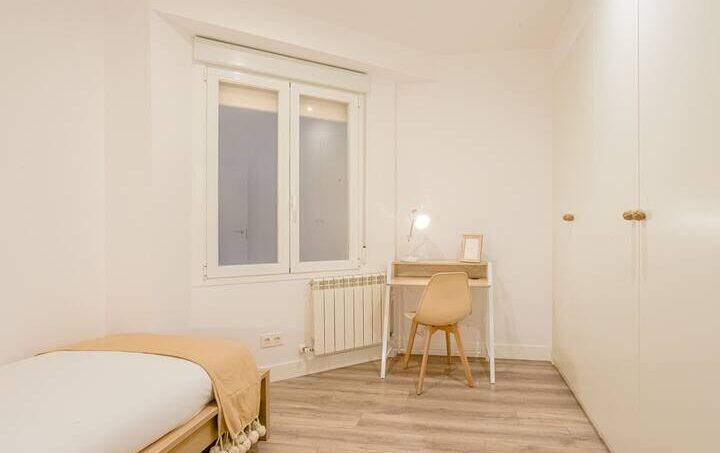 Sharing Co presents this modern and spacious property perfect for families, students and remote workers looking for comfort and luxury. It has three bedrooms; the master with a double bed and views to a beautiful interior courtyard, a waking closet, and a private bathroom inside the room with two sinks and a large shower, the second is composed of a single bed, a desk, from where your best ideas will flow, and views to the interior, the third has a comfortable double bed with dressing table and views to the outside; all three spaces with closets included and built-in heating. The property has two additional bathrooms each equipped with a sink, shower WC and towel radiators. In addition, a bright and modern open bar kitchen with the necessary elements for you to prepare your favorite recipes during your stay and a washing machine. Within the same space, you will have a spacious living and dining room with a comfortable sofa, a TV with cable to enjoy your favorite programs, and a 6-seat dining room. But that’s not all, you will also have at your disposal a large terrace for exclusive use where you can have a coffee and read the book you like.