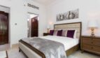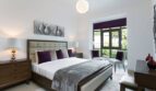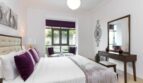 The master bedroom is furnished with a large double bed, bedside tables and premium bedding, a dressing chair, vanity with wall mounted mirror and floor to ceiling windows with seating.