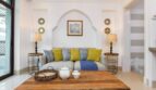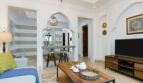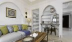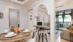 This bright high-end apartment with superior finishing and stunning architectural features split an open-plan property into designated areas without limiting on space. The communal area features a stylish four-seater dining table, lounge area with a three-seater sofa, a TV, coffee table and floor to ceiling windows. From here you can access the furnished balcony.