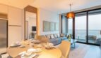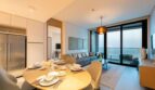 Enter to breath-taking blues flooding in from the water body beyond. The lounge is a centre of calm featuring a plush carpet, a couch you can sink into, a large TV, coffee table, amazing art and is set against the floor to ceiling sparkling water views from the furnished balcony. The dedicated dining area is furnished with a table to seat four. The kitchen shares the same space and is fitted with all the appliances needed for a seamless stay.