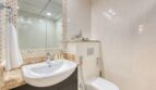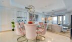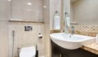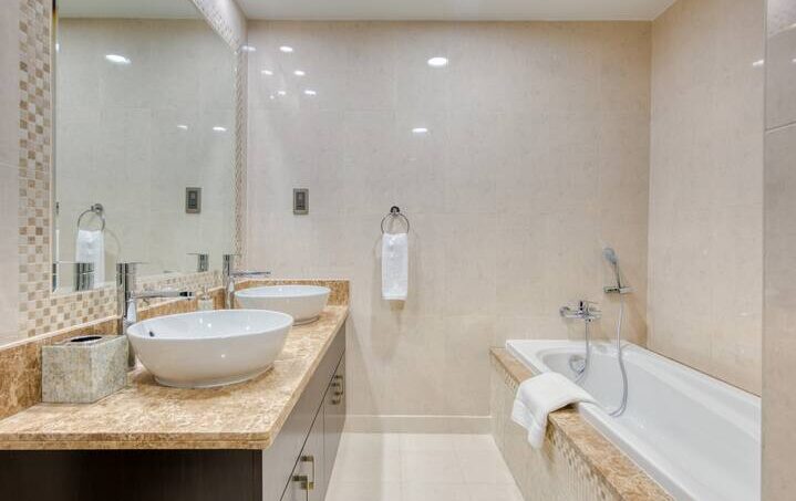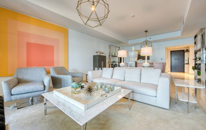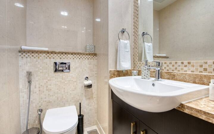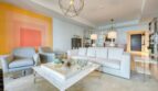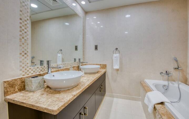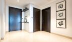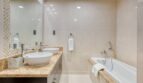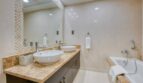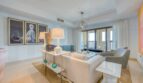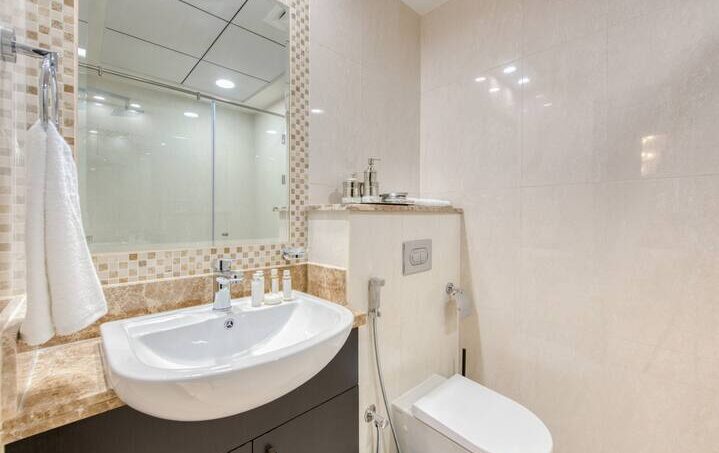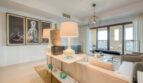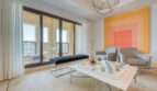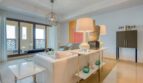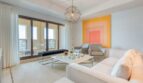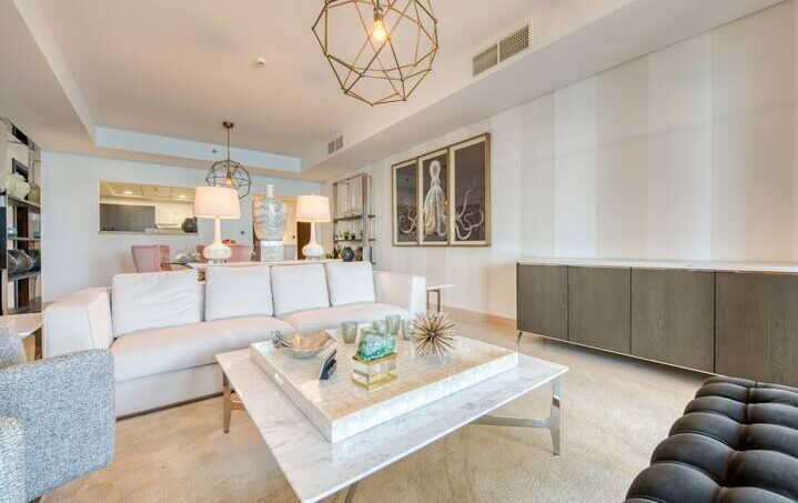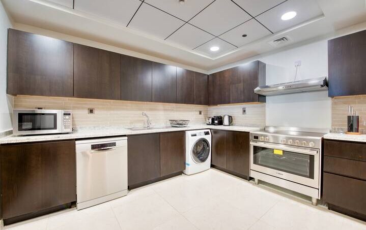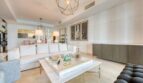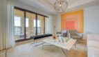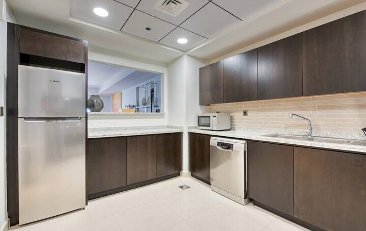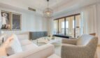 The living space of this two-bedroom apartment has fabulous furnishings and fittings to include a large sofa and accompanying seating, a coffee table, lamp lighting, modern art a TV and access to the balcony. There is a stunning round dining table with comfortable seating to accommodate for up to even guests. The fully fitted kitchen comes complete with all the necessary appliances including a coffee machine for a seamless stay and those special extra’s of High-quality cabinetry and granite tops that adds to it’s established air of elegance.