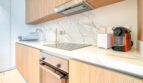 The kitchen shares the same space and is fitted with all the appliances needed for a seamless stay. The lounge is a centre of calm featuring a stylish seating arrangment and a smart TV.