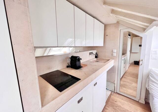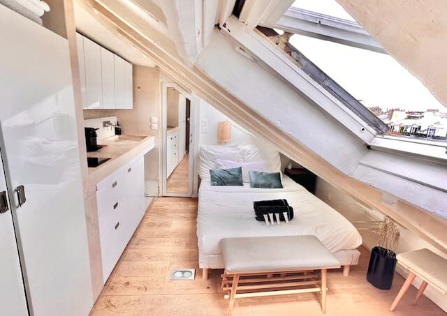 Nous vous proposons ce studio typiquement parisien, une chambre de bonne réaménagée en un véritable petit cocon de 16m2 sous les toits de Paris avec un charme fou ! ?