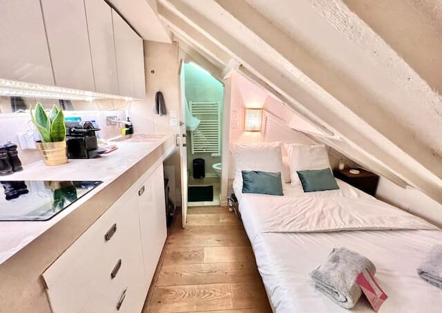 ⭐️ C’est un charmant tiny appartement avec un lit de 140×200 idéal pour 1 personne, mais peut accueillir jusqu’à 2 personnes ?