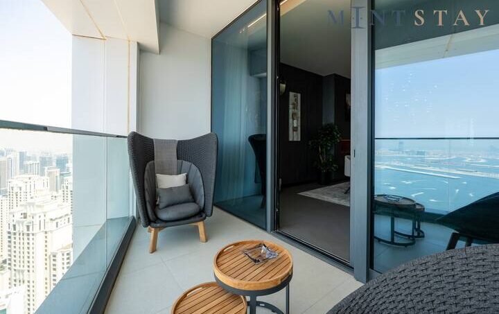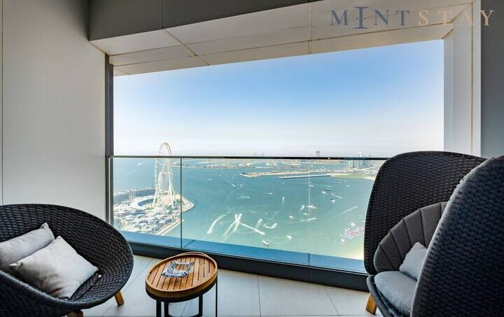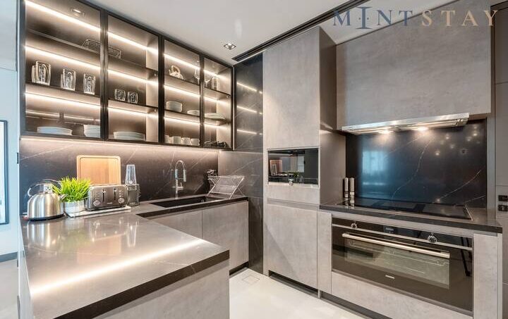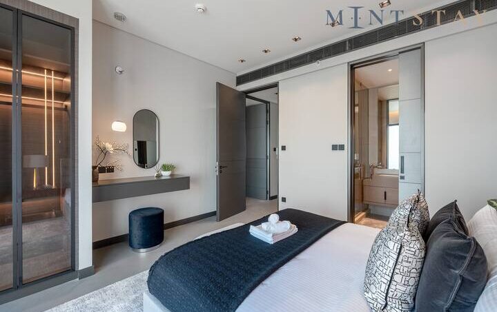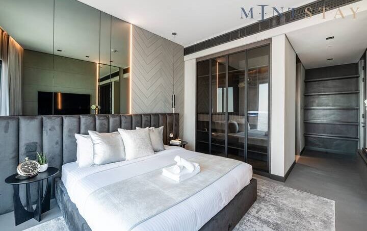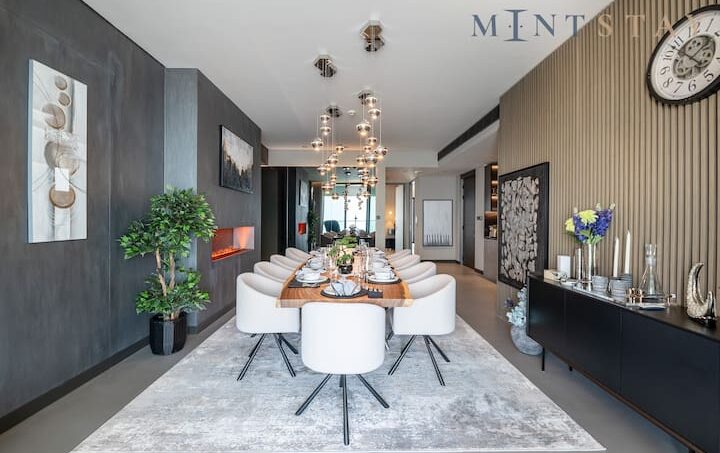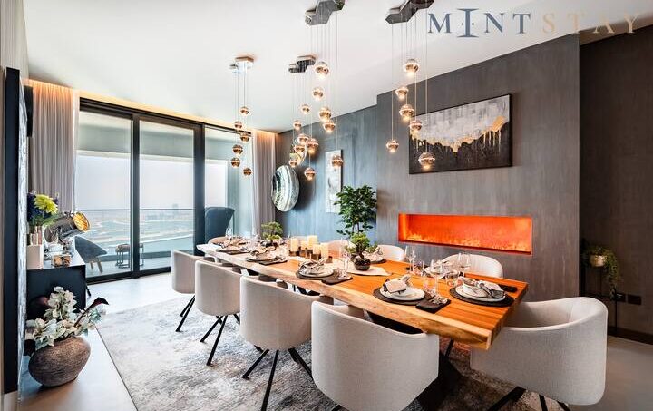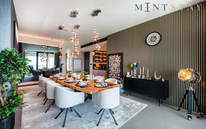 A secret bedroom, a wine cellar, a firelit centerpiece, and beach and city views – all in a monochromatic setting with high-end and functional furnishings. Trust me, this apartment stands out – its neighborhood is also one of Dubai’s top destinations, so expect easy access to many trending spots like The Walk at JBR and Ain Dubai at Bluewaters Island. Plus, there’s a plethora of cafes and restaurants nearby, not to mention a private beach, pool, and gym.