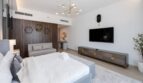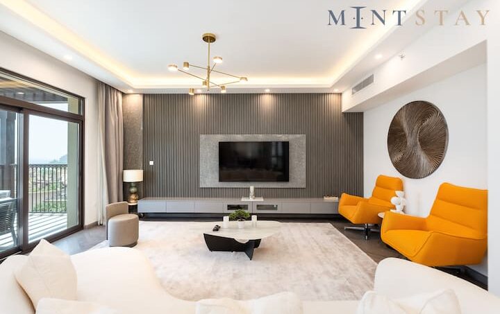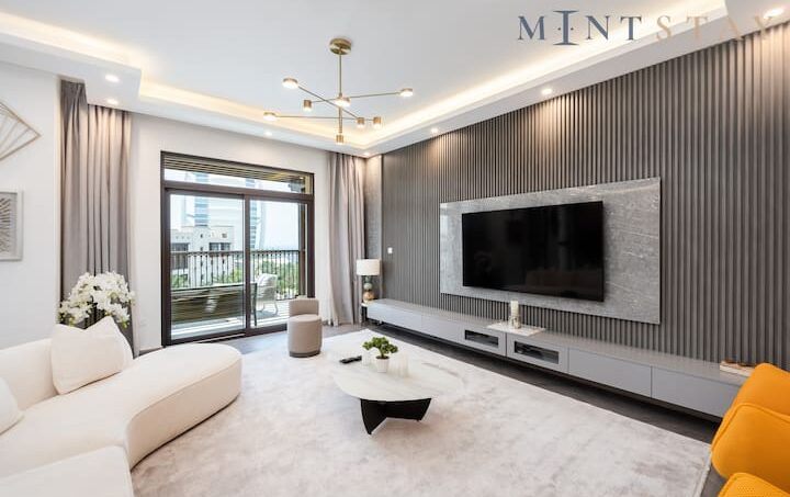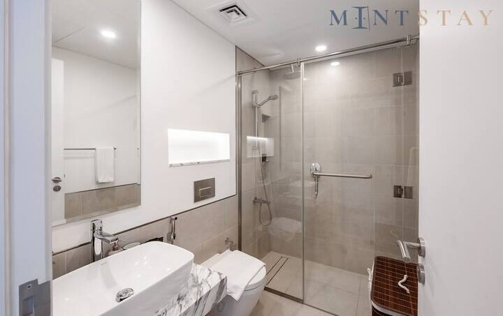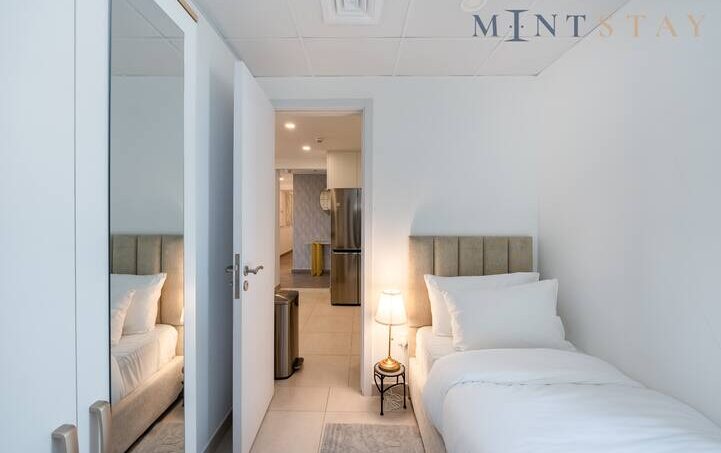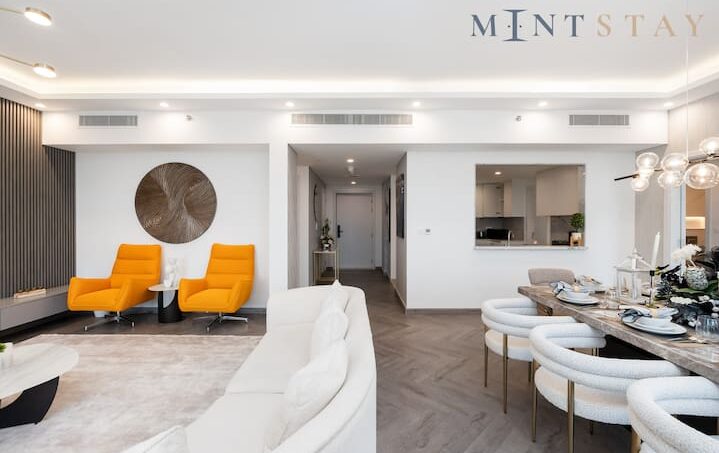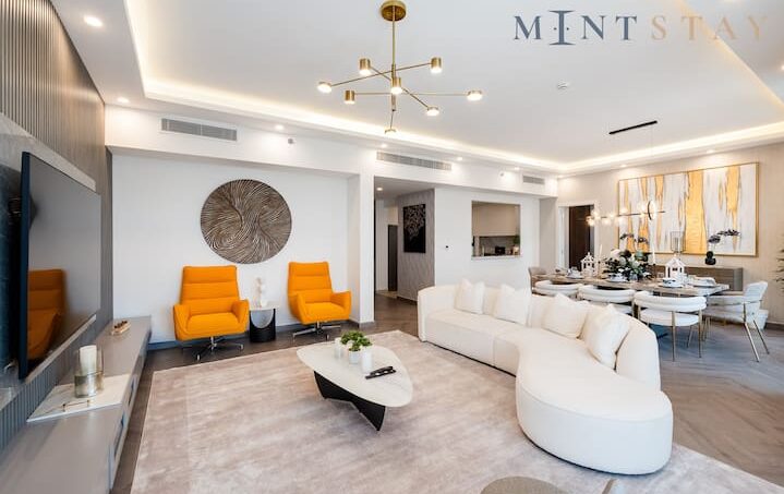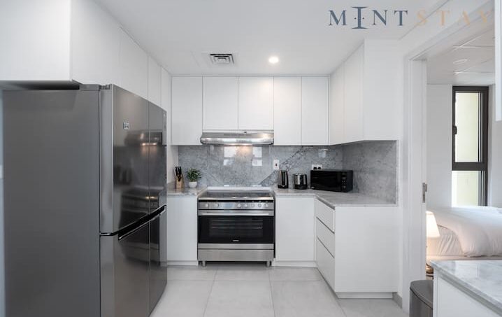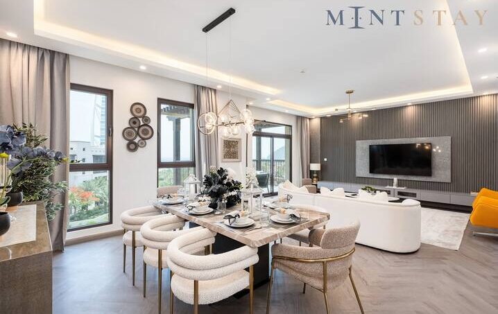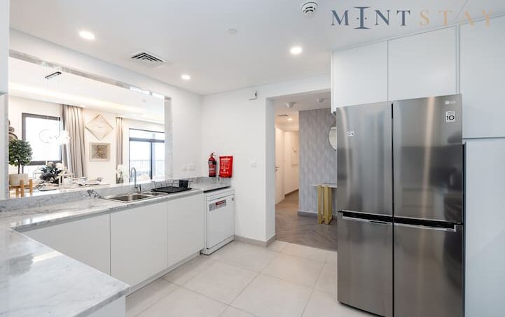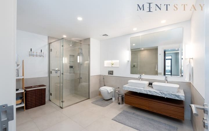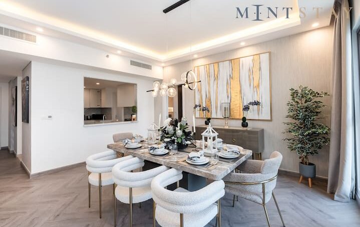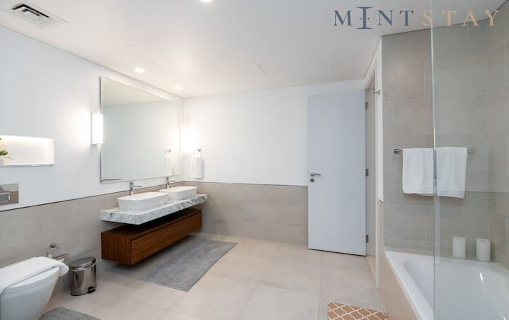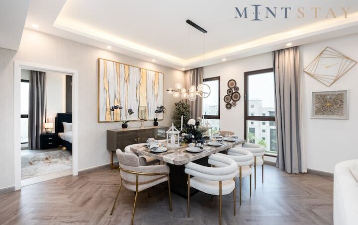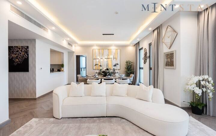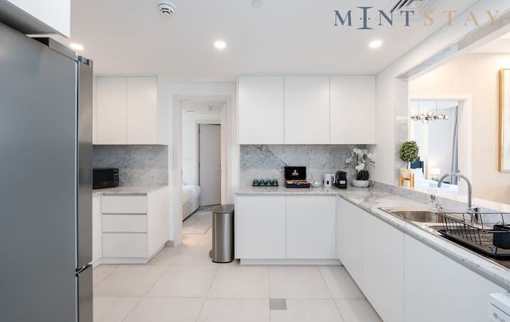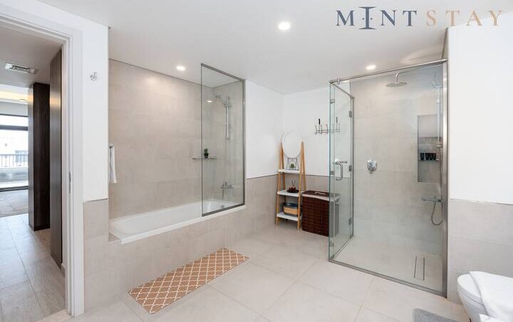 Feel like a VIP while sipping your mocktail at night with a full view of the Burj Al Arab from your private balcony. Need more luxury? Head over to the rooftop and take in the stunning city view. If you prefer a quieter, more private atmosphere, why not relax on the curved sofa and catch up on your favorite TV series? And if takeout loses its appeal, head to the fully equipped kitchen stocked with all the essentials: stove, oven, microwave – you name it. After indulging at the modern dining table, simply load everything into the dishwasher. Plus, there’s a washing machine for your laundry needs and high-speed Wi-Fi to stay connected with your friends.
