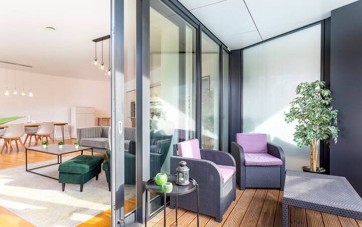 The smoke-free property features a living room, one bedroom, one bathroom, a stylish kitchen, and a balcony.