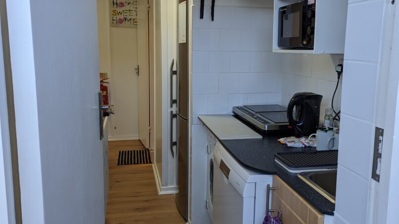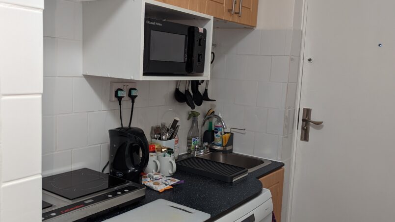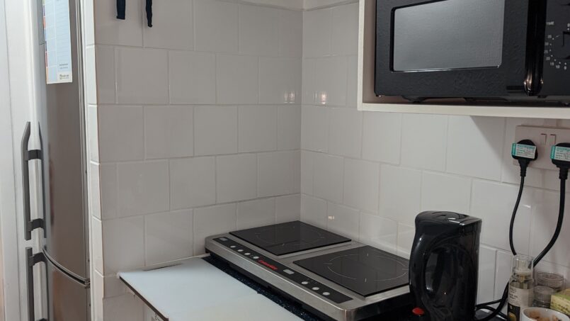The kitchenette has a fridge/freezer, a hob, a kettle and a microwave.