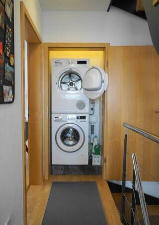 Im Obergeschoss befindet sich eine kleine Kammer mit Waschmaschine und Trockner, Nutzung (9-20 Uhr) auf Anfrage.