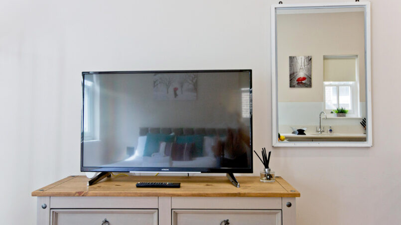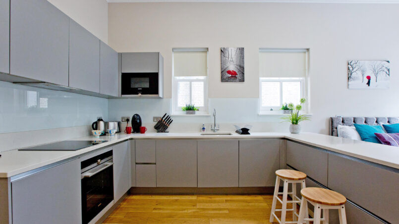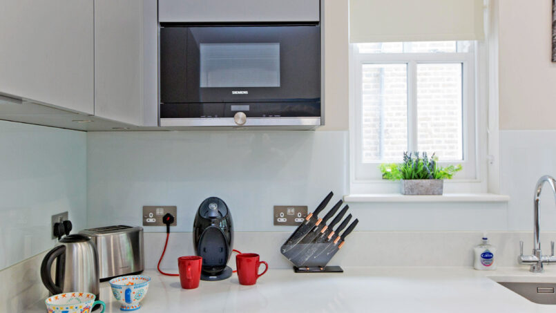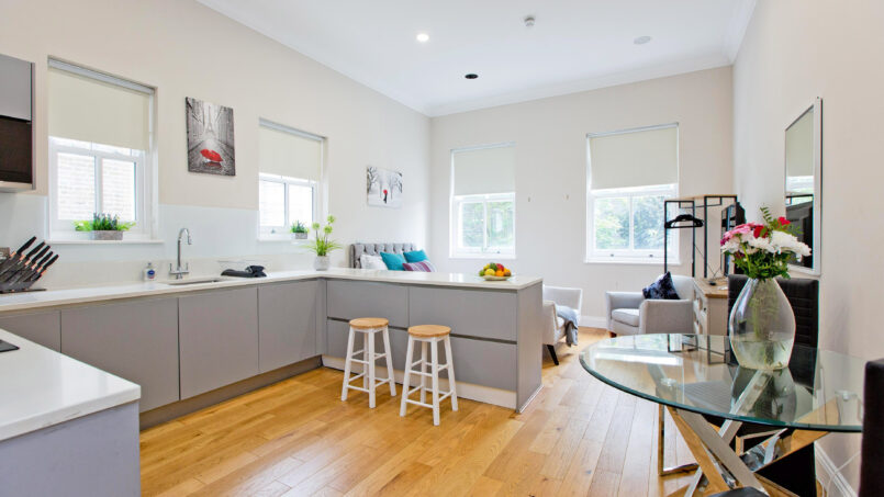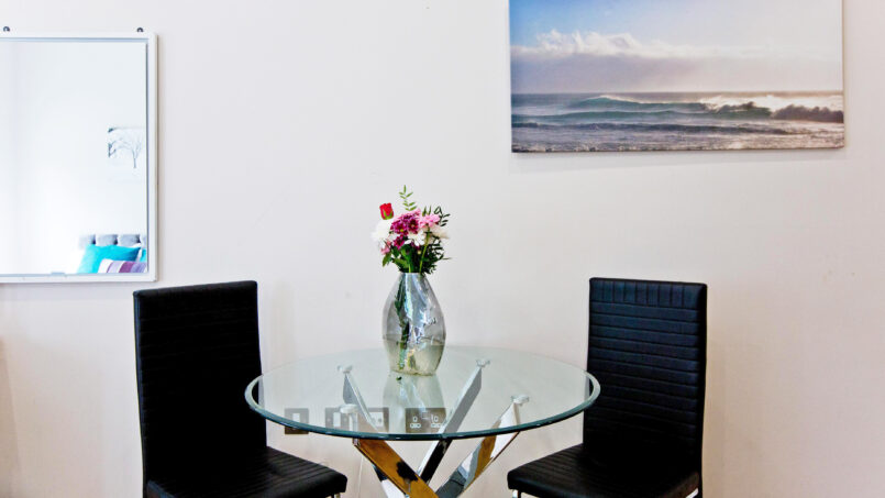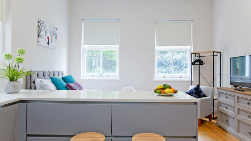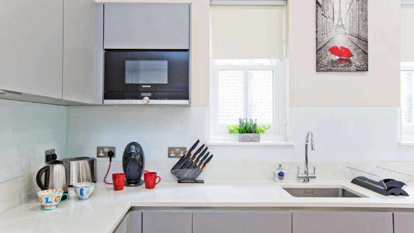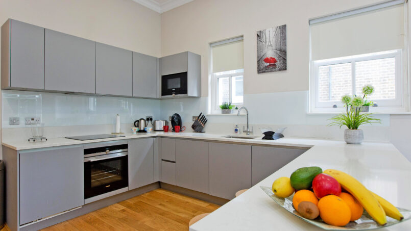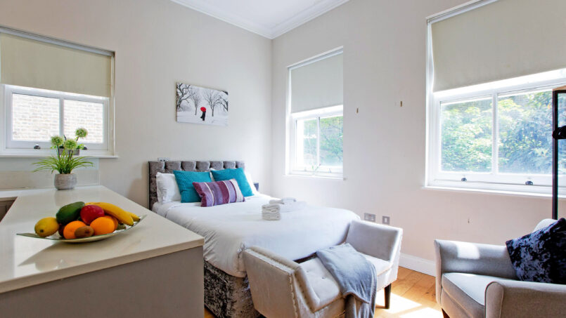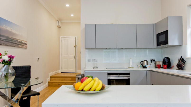 This studio is superbly finished and equipped with a full range of high end integrated appliances (Hob, oven, microwave, fridge/freezer, washer/dryer and dishwasher). The kitchen area incorporates a dining table that provides ample eating or work space for 1 or 2 people.