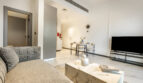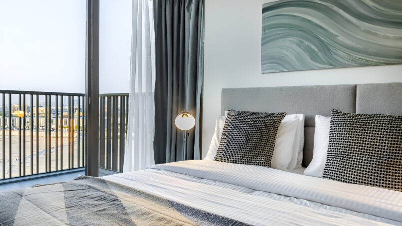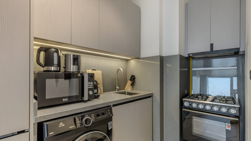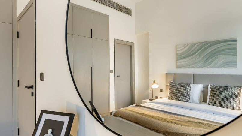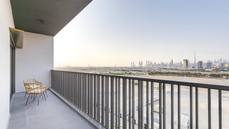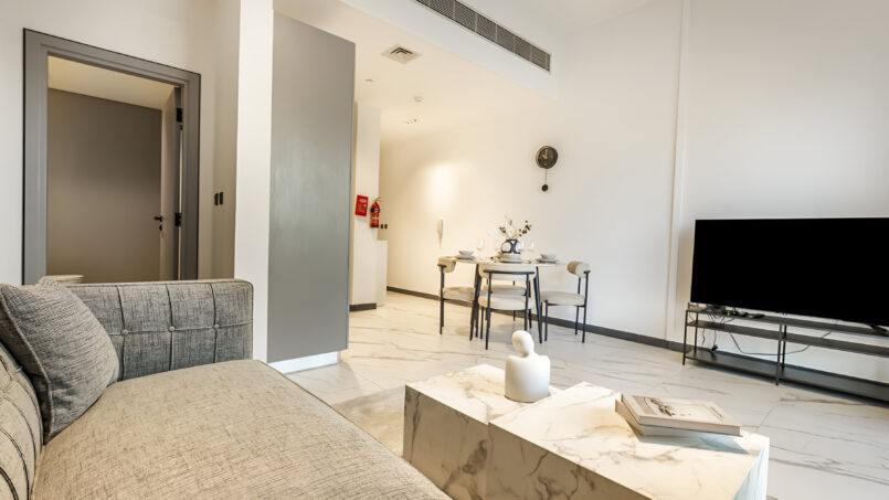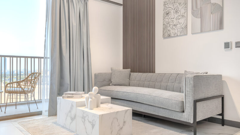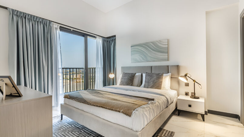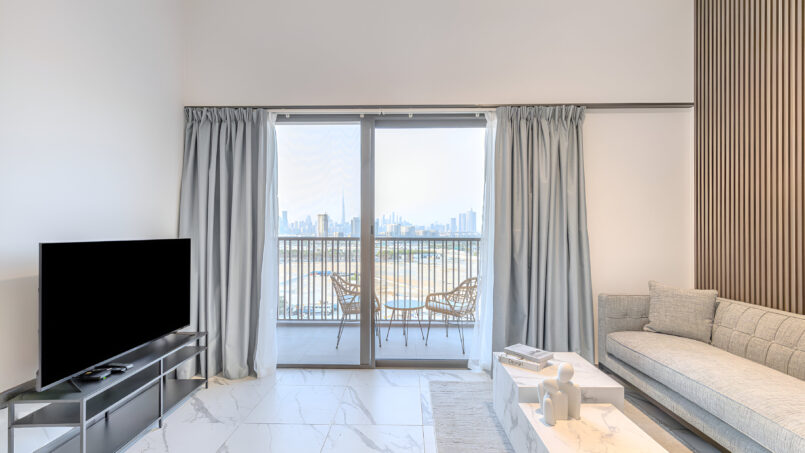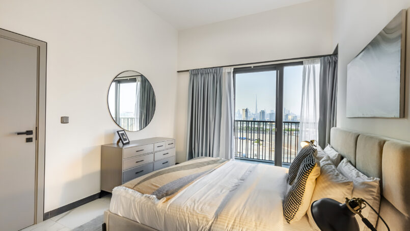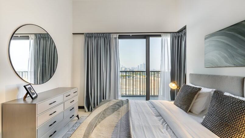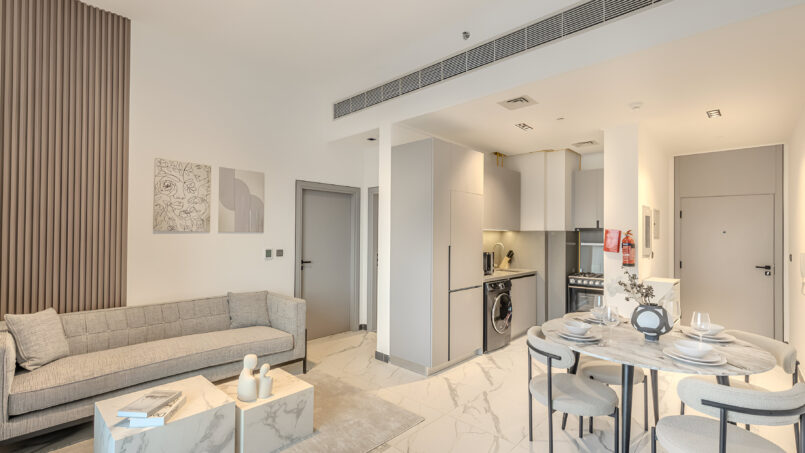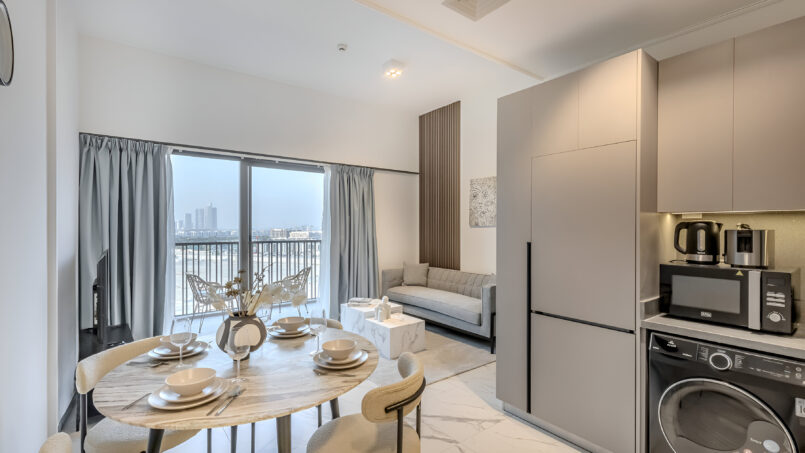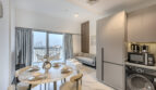 Brand new one bedroom apartment located in District Seven , Mohammed Bin Rashid City. The property features high ceilings , large windows , balcony that opens towards Burj Khalifa view. The apartment has contemporary style decoration in combination with original wooden elements and come together with shades of light tone, making the apartment an exquisite elegance. The bedroom is equipped with bed topped with high-quality mattress, wardrobe, and en-suite bathroom filled with toiletries and fresh towels. The living room, is fitted with a large sofa, modern flat-screen TV and a big dining table with four chairs. The kitchen is fully equipped with all appliances. The apartment is very cozy, spacious, and ready to move in, with all the appliances to ensure a smooth and perfect stay.