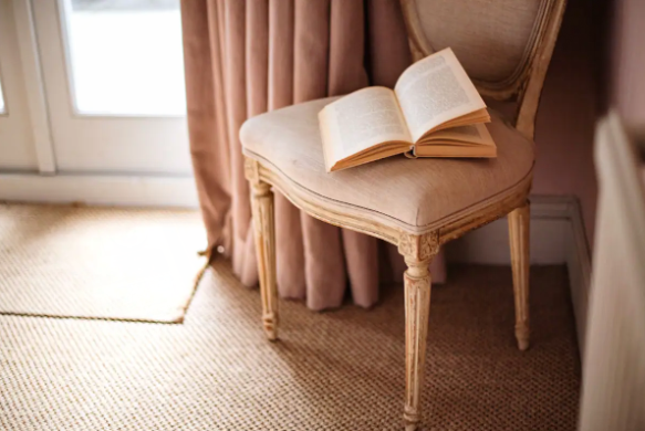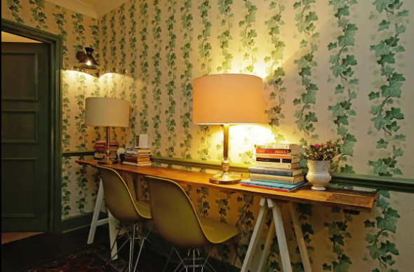 Along the broad hallway, a two-seat workspace provides a semi-private desk for a laptop or two.