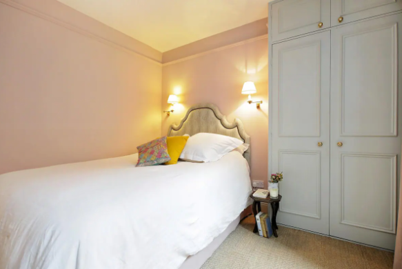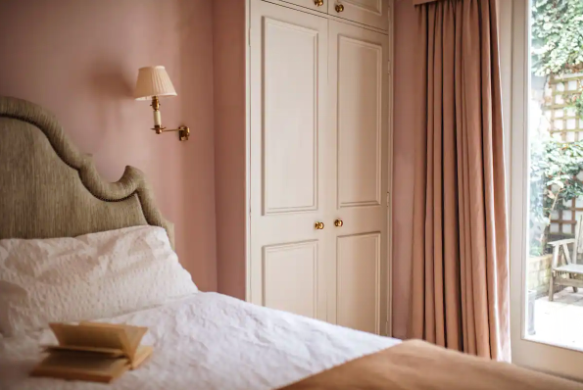 The serene master bedroom, with its warm rosy hues and large double bed, is a calming retreat after a busy day away. Offering the room plenty of natural light, the French doors swing open to reveal a romantic private terrace, perfect for curling up with a good book or simply smelling the beautiful roses. The guest bedroom offers a second comfy double bed, suitable for children or adults alike.