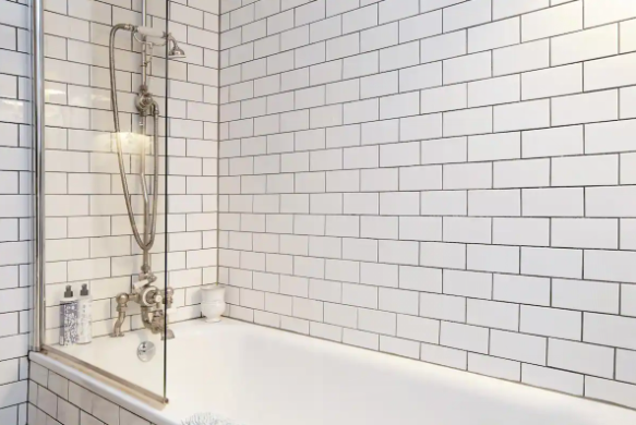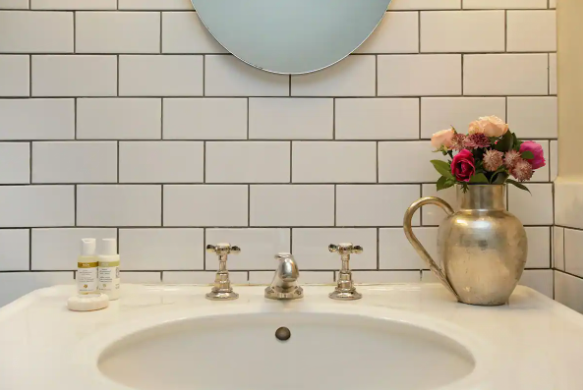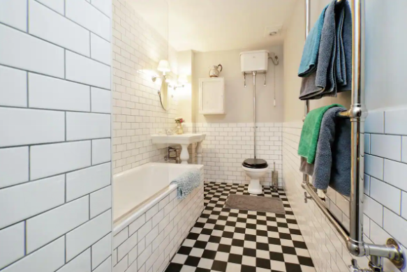 The spacious bathroom is on trend with a subway-tiled backdrop juxtaposing the black and white checkered tile floor. A Parisian sink console, a Victorian high level toilet and deep-set shower bath with luxury chrome fixtures complete the vintage look. Plant-based REN Clean Skincare toiletries are provided.