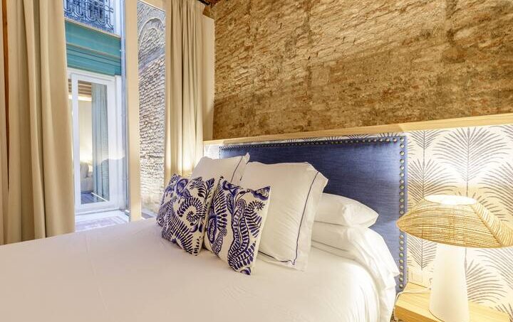 Tall windows and balconies provide captivating views of the Andalusian courtyard, immersing guests in a warm atmosphere of calm and elegance. A work of preserving its charm in each element: restored marble and hydraulic floors, rehabilitated columns, rescued doors, recovered interior patio or the simple restored and reborn fountain. The charisma of each architectural element transports our guests to a time of freshness and panache.