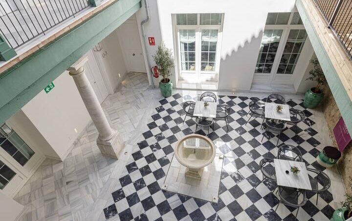 Tall windows and balconies provide captivating views of the Andalusian courtyard, immersing guests in a warm atmosphere of calm and elegance. A work of preserving its charm in each element: restored marble and hydraulic floors, rehabilitated columns, rescued doors, recovered interior patio or the simple restored and reborn fountain. The charisma of each architectural element transports our guests to a time of freshness and panache.