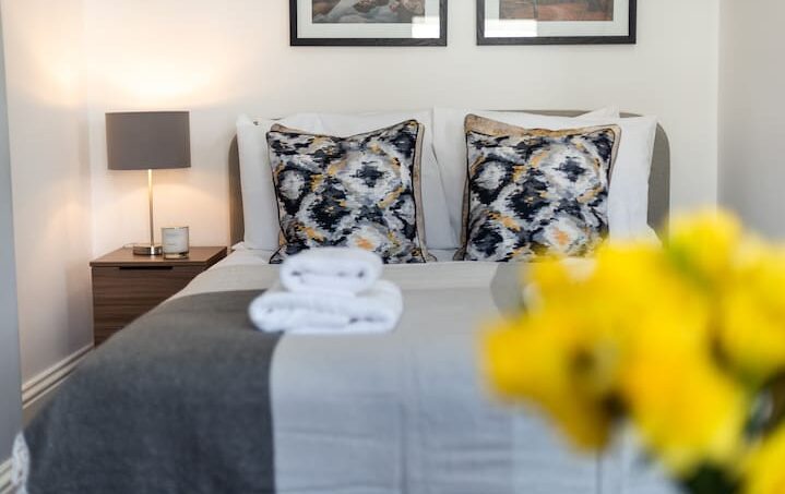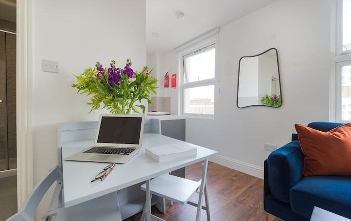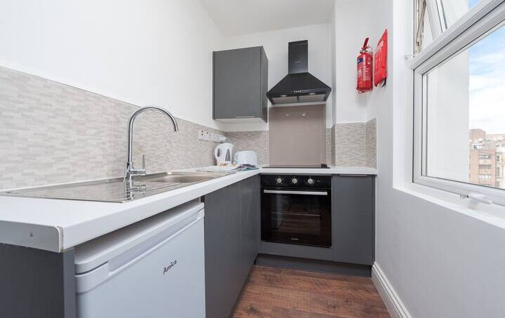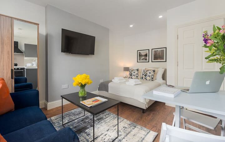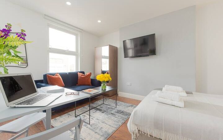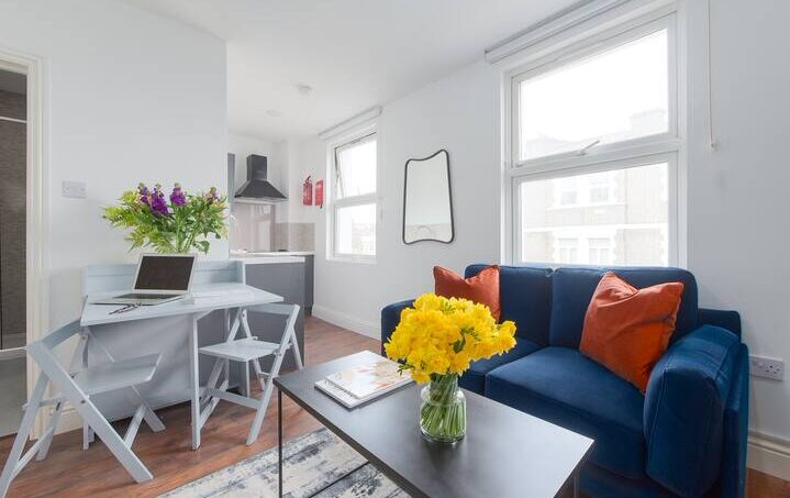 This modern and stylish studio apartment offers plenty of space and light. The open-plan space has a compact kitchen area, fully equipped with kettle, toaster, and fridge, compact dining area and bedroom. The bathroom is neat and has a standing shower, toilet and basin. The apartment is ideally located near to Earl’s Court tube station and West Brompton Overground. There is also a Tesco Superstore across the road. Weekly cleaning is included for stays over 13 nights.