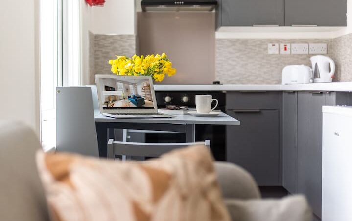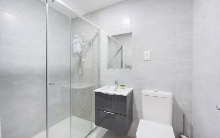 This modern and stylish studio apartment offers plenty of space and light. The open-plan space has a compact kitchen area, fully equipped with kettle, toaster, and fridge, compact dining area and bedroom. The bathroom is neat and has a standing shower, toilet and basin.