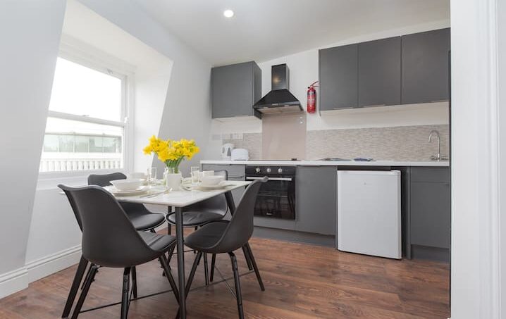 This modern and stylish 2-bedroom apartment offers plenty of space and light. The open-plan space has a compact kitchen area, fully equipped with kettle, toaster, and fridge, compact dining area and bedroom. There is a double bed in the master and a single bed in the second bedroom.