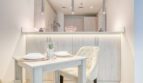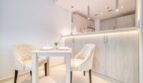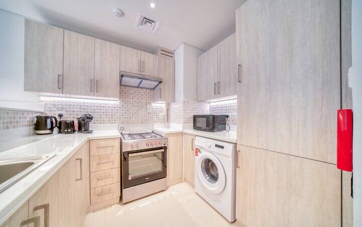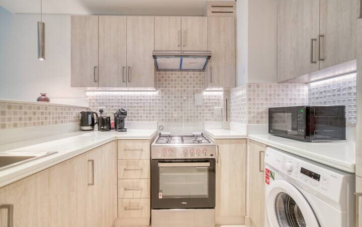 What more could you desire from a high-end retreat? This apartment offers carefully curated decor, luxurious furnishings, and top-notch appliances to cater to your every need. When it’s time for a cozy binge-watch of your favorite show, sink into the plush sofa adorned with tastefully selected pastel-colored cushions, complemented by an elegant coffee table and an accent chair. And when hunger strikes and you’re in the mood for a quick meal, you’ll find a well-appointed kitchen with a fridge, gas stove, oven, microwave, toaster, electric kettle, and even a Nespresso machine for coffee enthusiasts. When it’s time to dine, a charming table for two awaits. And for the convenience of your laundry needs, a washing machine is also at your disposal.
