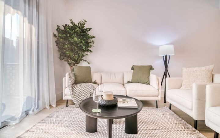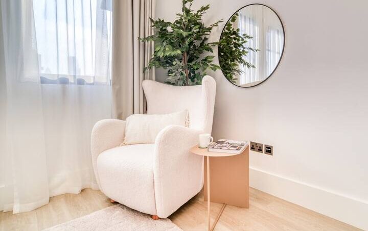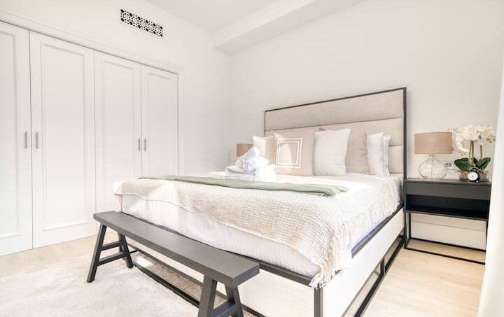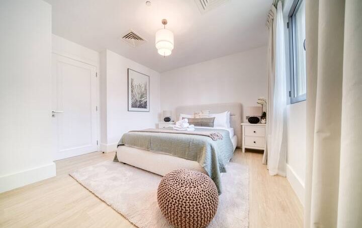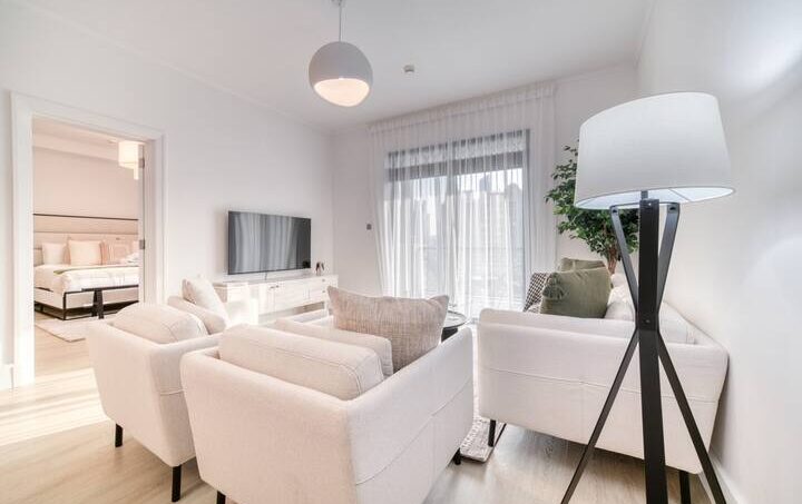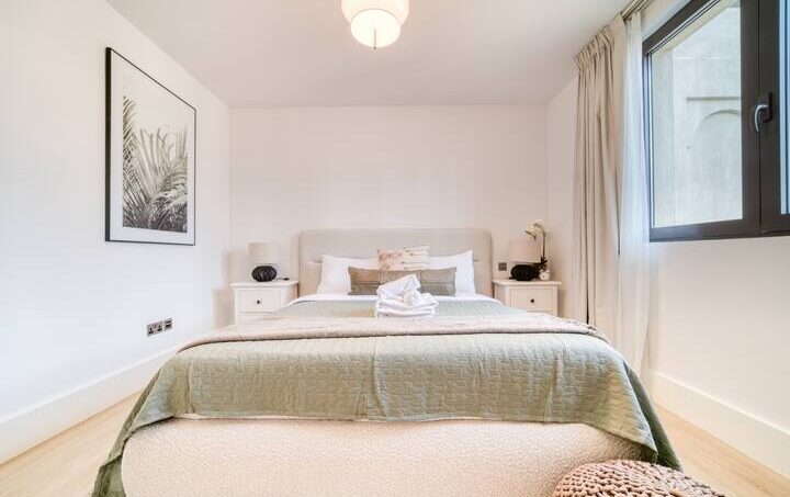 Prepare to be captivated as you step into this spacious, well-lit, and impeccably clean apartment. It’s the ideal sanctuary for relaxation and rejuvenation, offering a luxurious king-size bed with premium linens and pillows that will cradle you in comfort. For added convenience, there’s a cozy bench, and if you fancy some reading, a modern chair by the window awaits, complete with a handy side table. The bedroom also boasts a roomy wardrobe to keep your belongings organized, and the ensuite bathroom is a true indulgence, featuring a bathtub with a showerhead and a generous vanity unit for a spa-like experience.