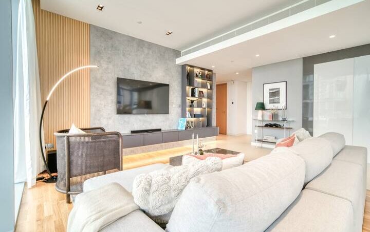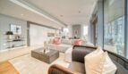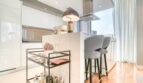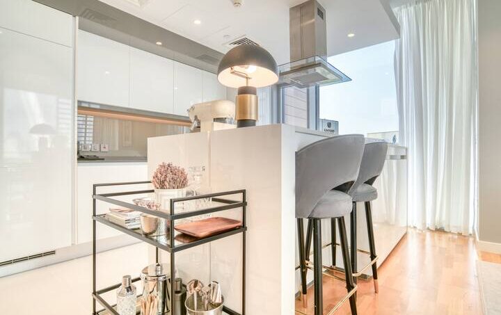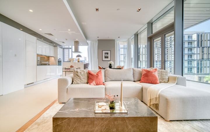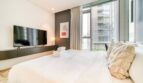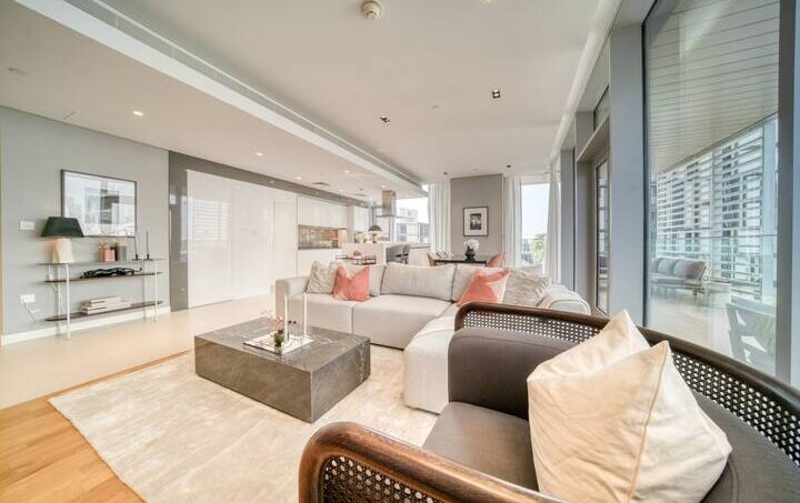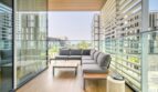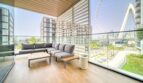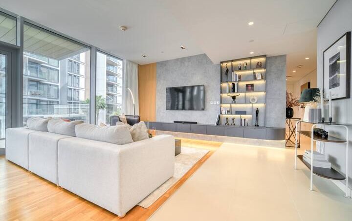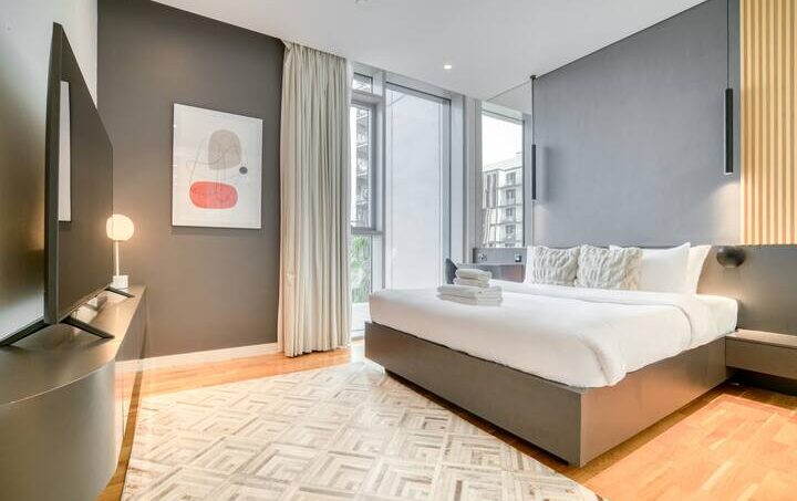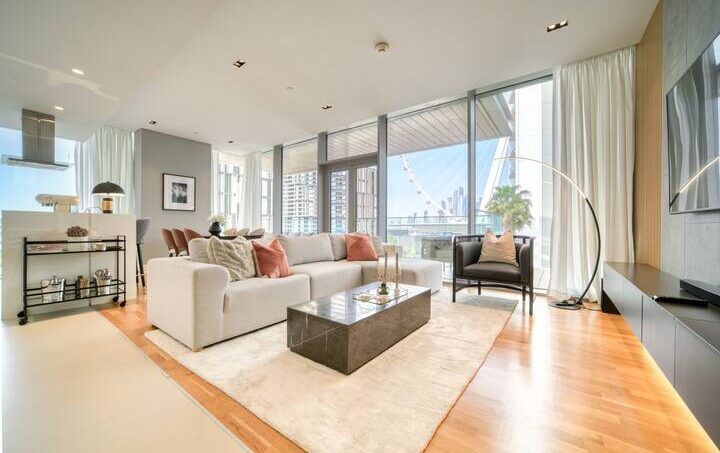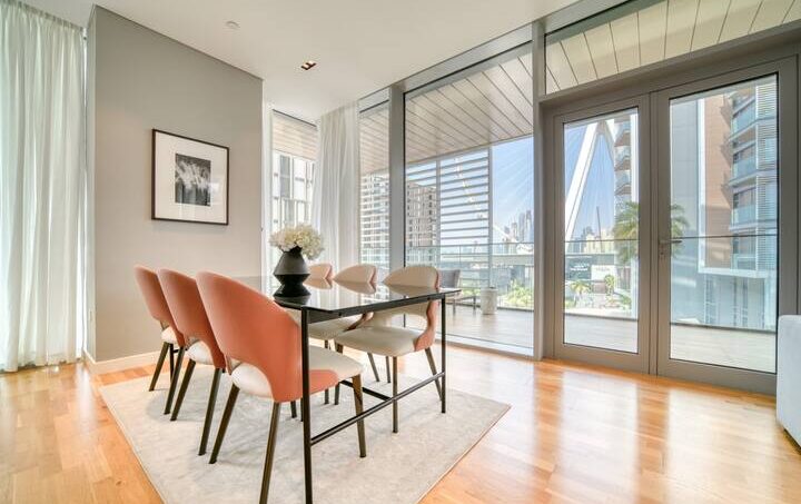 As you step inside, the lavishness and comfort of this apartment envelop you, promising a truly luxurious experience. The interior is bathed in natural light, and the flowing living area adds to the sense of comfort, creating an inviting and snug space. The stylish living room features a sleek L-shaped sofa, a marble block coffee table, impressive fixtures, and a smart television for entertainment. Beyond the living area, a thoughtfully designed balcony awaits, perfect for meals and cocktails while soaking in the stunning views of Ain Dubai and the vibrant community.