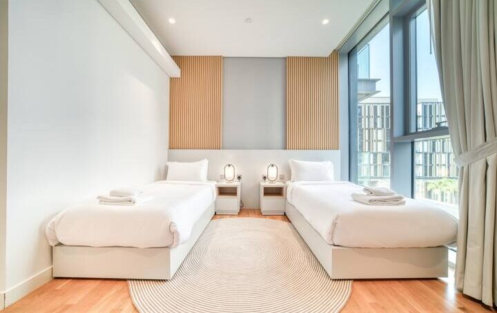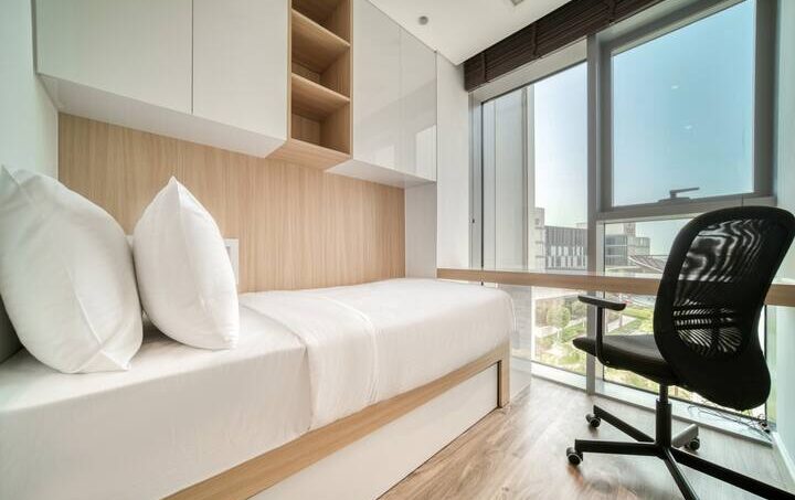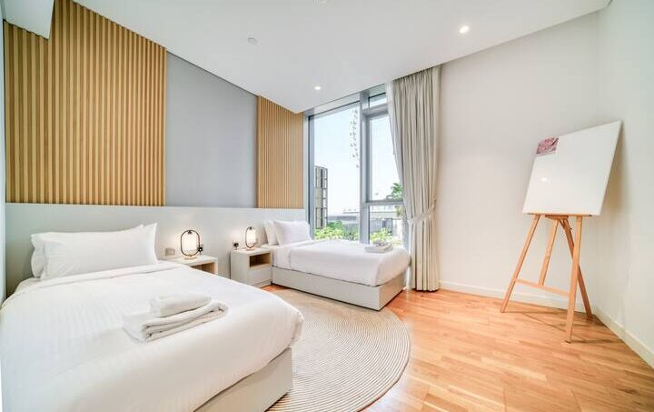 We’re confident that you’ll find the second bedroom to be cozy and comfortable. It features two single beds, and the attached bathroom comes with a convenient shower. The room also offers ample storage space with a wardrobe, all while boasting a pleasing aesthetic. Notably, there’s a window that treats you to breathtaking community views, adding to the overall charm of the space.