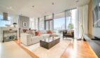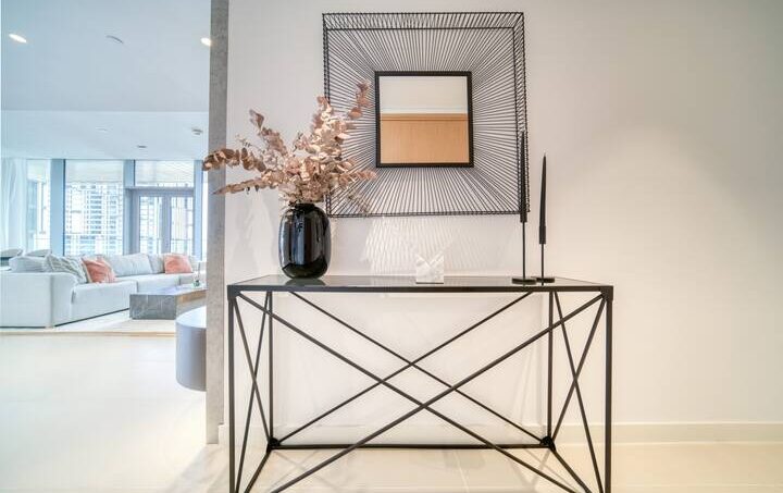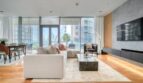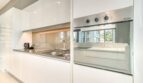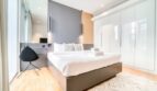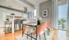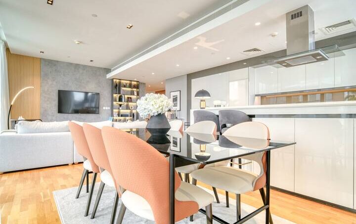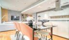 The well-equipped kitchen boasts high-end appliances and modern cabinets, ensuring convenience and satisfaction. The contemporary dining table, seating six, is perfect for serving meals prepared in the kitchen. This space ensures an enjoyable dining experience with your loved ones.